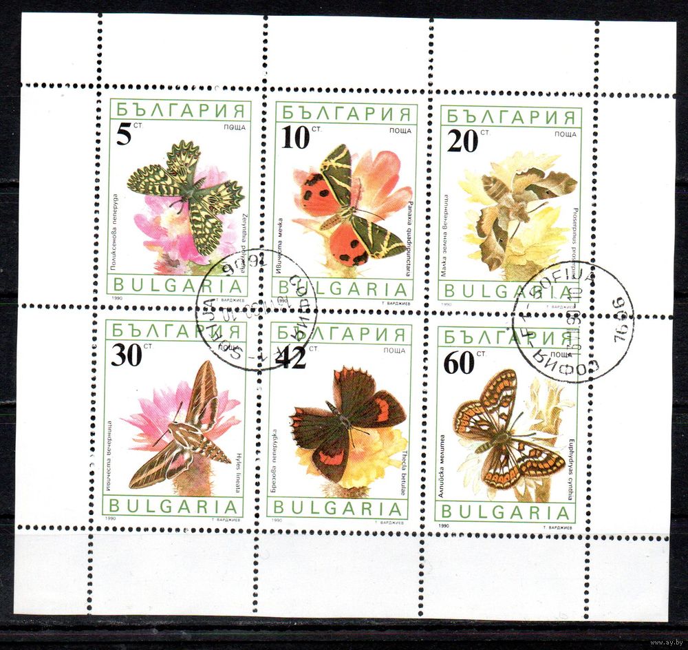 Бабочки Болгария 1990 год серия из 6 марок в листе