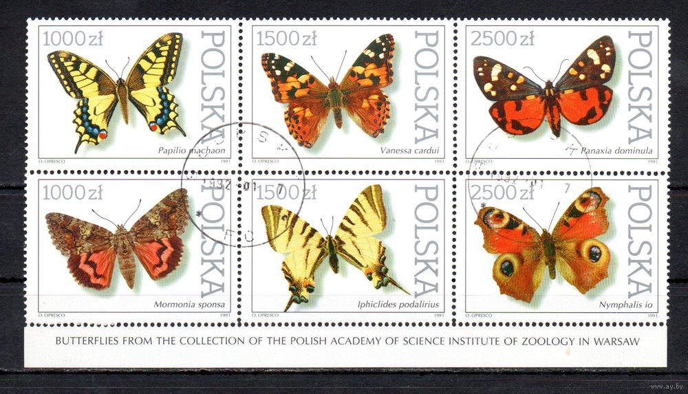 Бабочки Польша 1991 год серия из 6 марок в сцепке