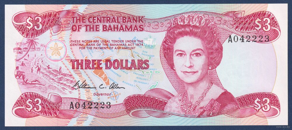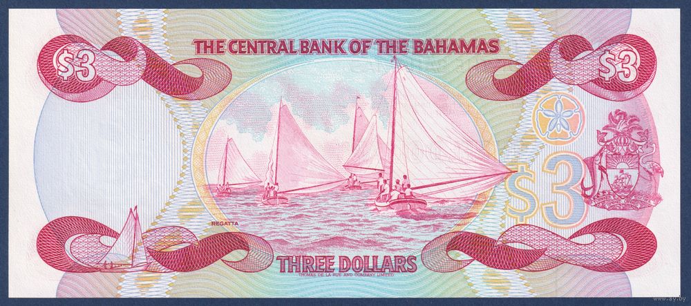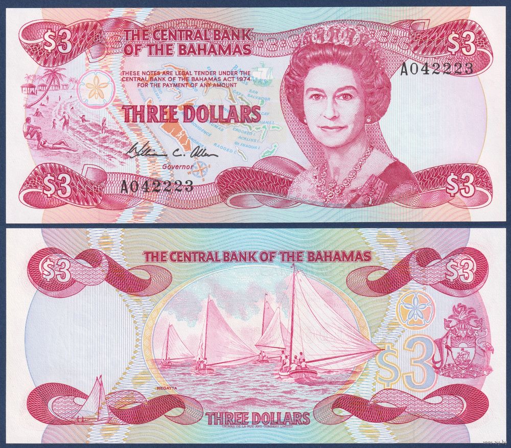 Багамские острова (Багамы), 3 доллара 1984 г., P-44 (A, королева Елизавета II, парусные лодки), UNC