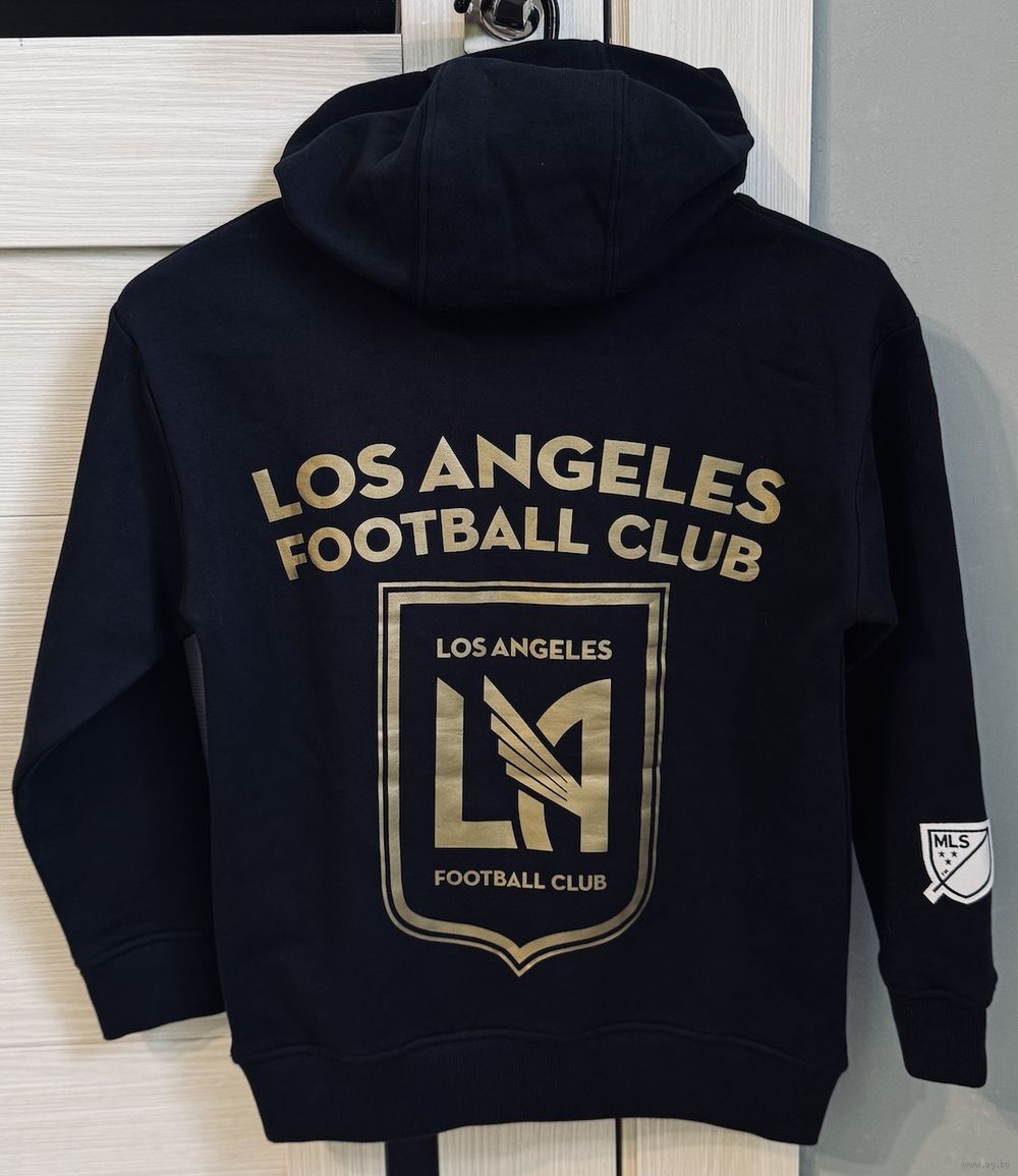 Байка George. Сток. Рост по ярлыку 122-128 см. Ткань хлопок+полиэстер. Утепленная (с начесом). Карман-кенгуру. Цвет черный, принт золотой.