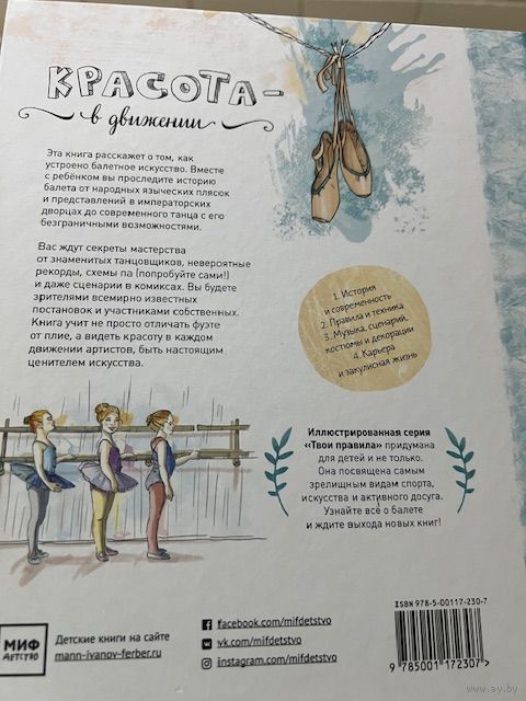 Хотите вдохновить ребенка на занятия балетом, открыть ему красоту балетных па? А может быть, он уже болеет танцем и хочет узнать о нем как можно больше? Тогда эта книга для вас. Она расскажет историю балета от предпосылок его появления (языческих плясок и представлений в императорских дворцах) до современного танца. Вы сможете проследить вместе с ребенком развитие этого искусства через акварельные иллюстрации Анастасии Батищевой. В книге даются основы балетной теории. Она расскажет о том, что важно в спектакле и из чего состоит театр, а также покажет, что происходит за сценой: декорации, костюмы, сценарий, музыка. Вы и ваш ребенок сможете сами попробовать сделать несколько па по схемам. Вы узнаете секреты мастерства нескольких знаменитых танцоров: Ульяны Лопаткиной, Михаила Барышникова, Николая Цискаридзе, Дианы Вишневой и других. Книга научит не просто отличать фуэте от плие, а видеть красоту в каждом движении артистов, быть настоящим ценителем искусства балета. О серии «Твои правила» — детская иллюстрированная серия, посвященная самым зрелищным видам спорта, искусства и активного досуга. Книги на конкретных примерах объясняют ребенку историю появления той или иной дисциплины, теорию и практику, особенности обучения. Логика этих книг — от простейших знаний и самостоятельных навыков к достижению успехов и выходу на мировой уровень. Есть рекомендации, куда пойти учиться, как попробовать простейшие движения и начать карьеру. Серия показывает ребенку возможности спортивного досуга, в том числе такие его виды, которые находятся на стыке между спортом, искусством и игрой. Метаидея книг — выбор активного образа жизни способен повлиять на судьбу: карьеру, полноту жизни, здоровье. Любой интересный вид досуга можно попробовать самому, а не только наблюдать по телевизору. Поэтому в каждой книге содержится информация о том, где можно постичь азы той или иной дисциплины — в спортзале, в секции или на уличной площадке. Книги серии помогают видеть красоту человеческих движений, безграничные возможности тела и духа; ориентироваться в современном мире, встроиться в общество, в котором спорт и искусства являются излюбленной темой для обсуждения.