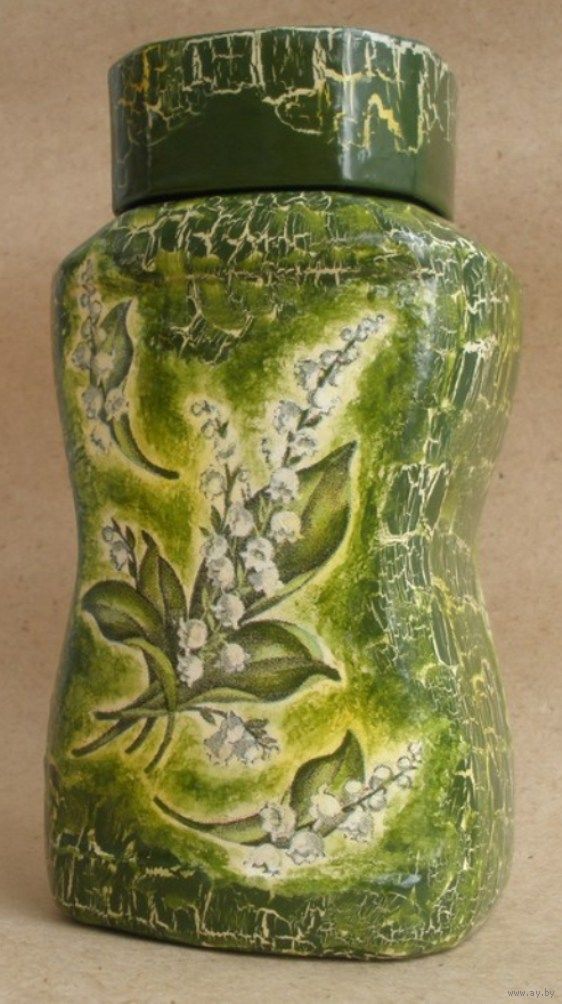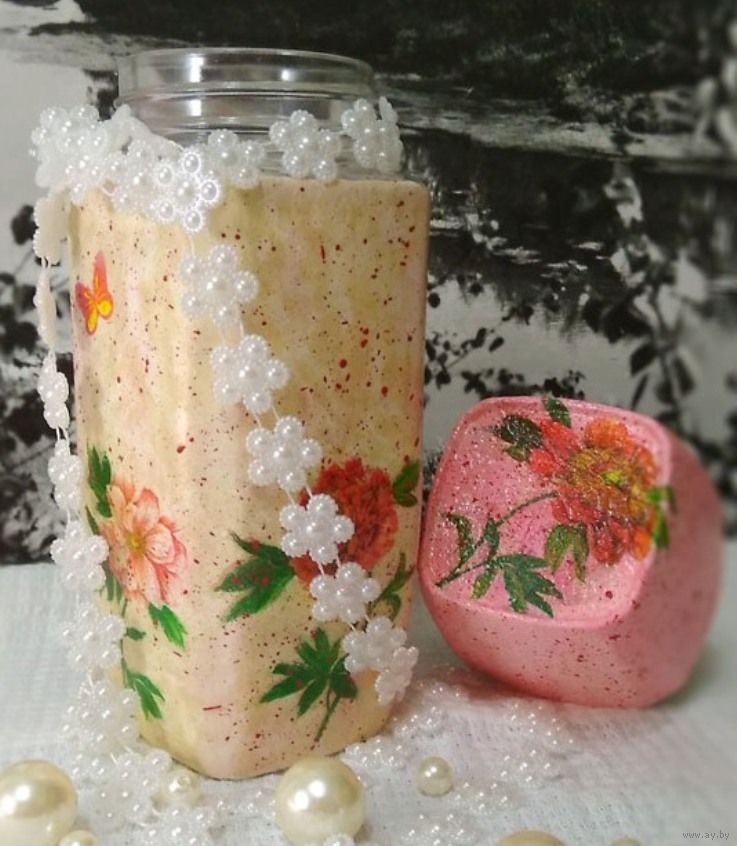 Объём банки-200гр сыпучего или 900мл жидкости, для изготовления вазочек- образцы декупажа на фото последних.