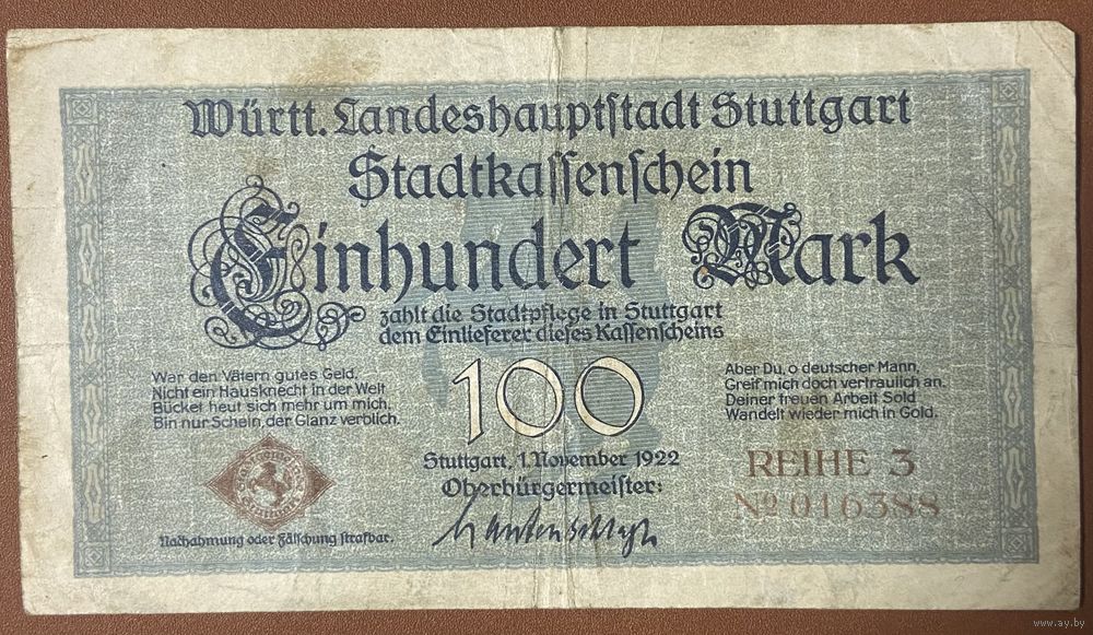 Банкнота 100 марок 1922 год. Штутгарт. Веймарская республика