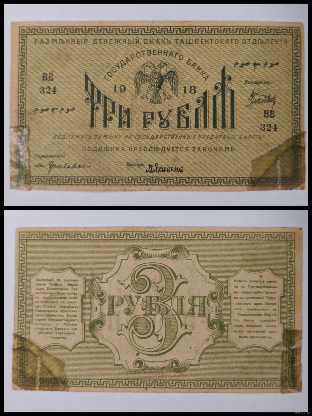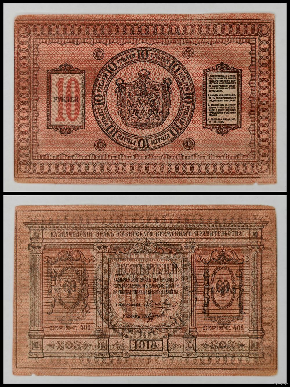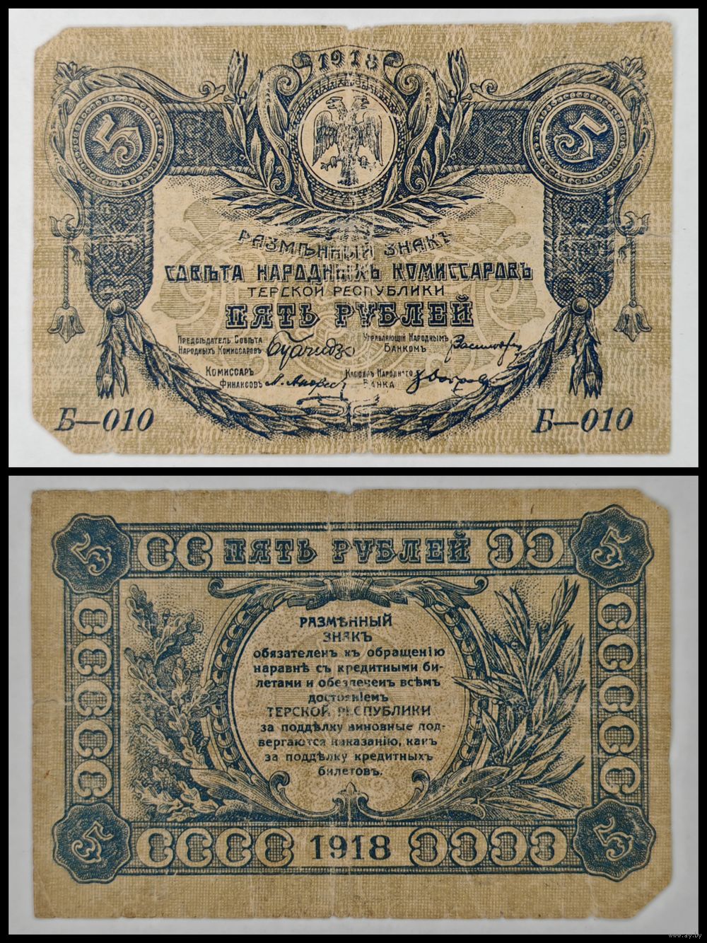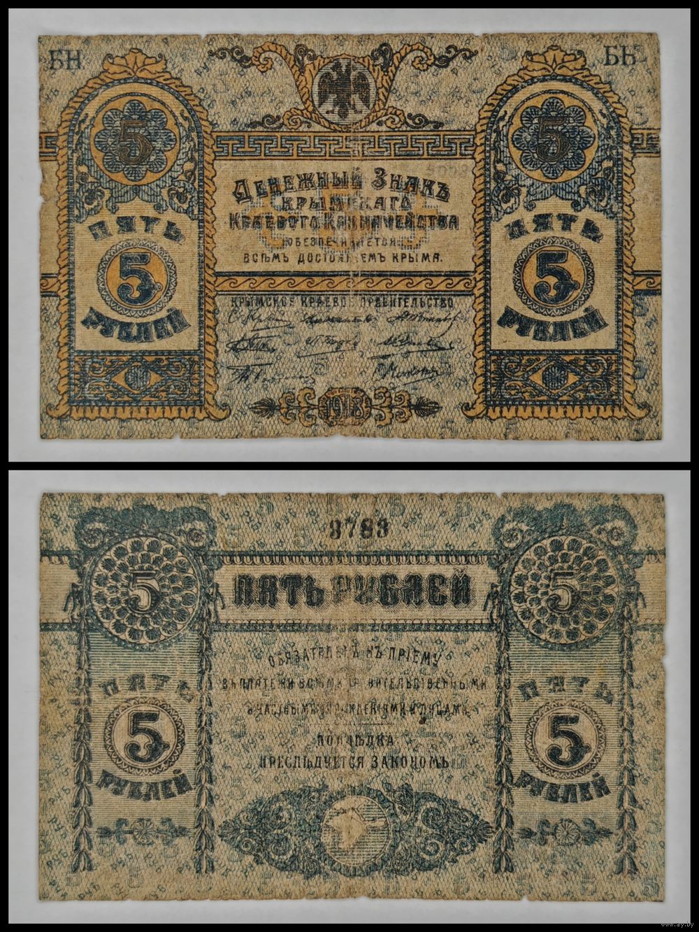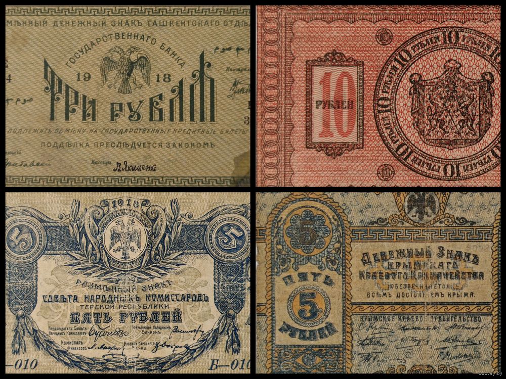 Банкнота 3 тубля, 5 рублей, 10 рублей 1918 гг. Туркестанского края, Терской республики, Крым, Сибирь. Одним лотом 4 шт. С рубля