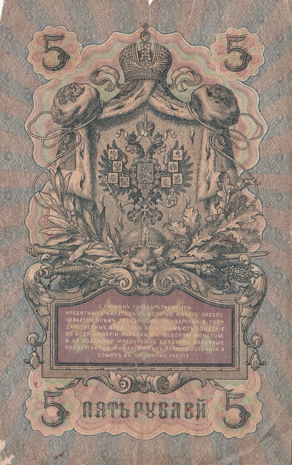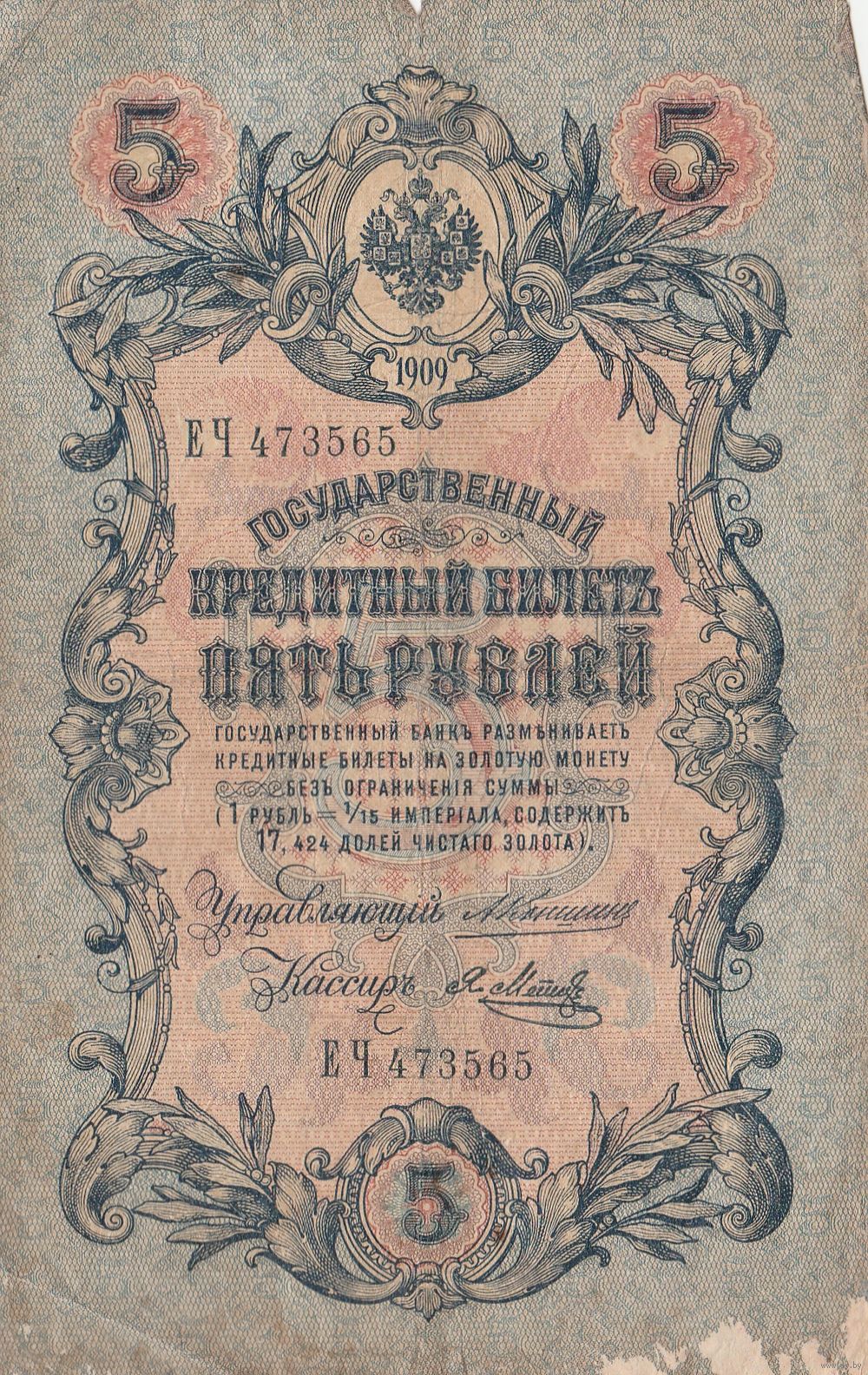 Банкнота 5 рублей 1909 года. ЕЧ. Управляющий Коншин Кассир Я.Метц