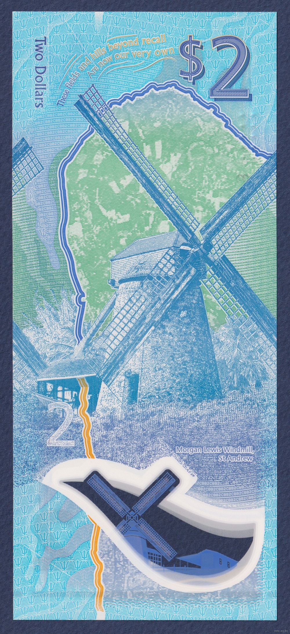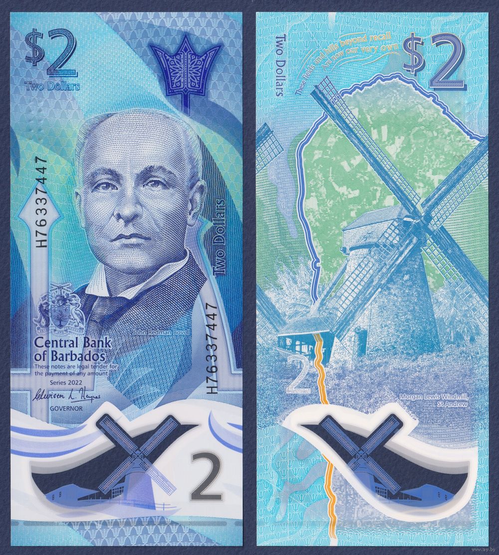 Барбадос, 2 доллара 2022 г, P-W80 (H, полимер, учёный Джон Эдвард Редмонд, мельница сахарного завода), UNC