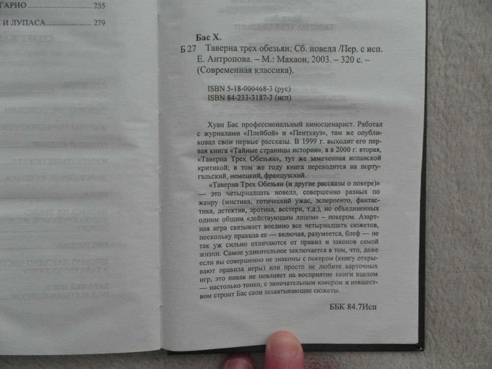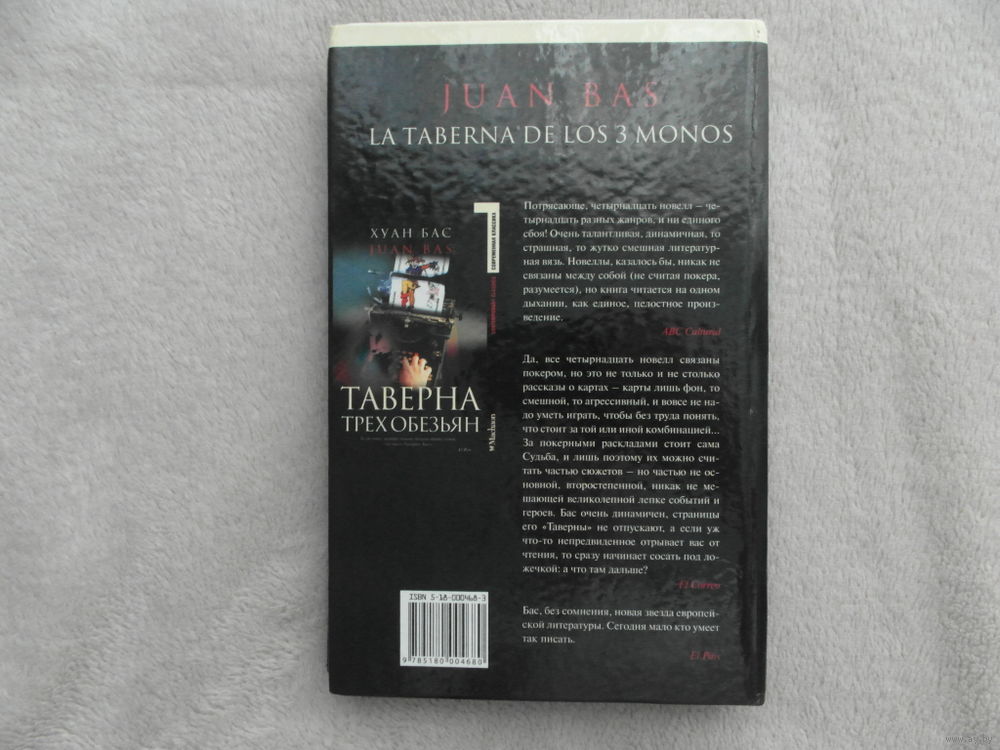 Хуан Бас - профессиональный киносценарист. Работал с журналами Плейбой и Пентхауз, там же опубликовал свои первые рассказы. В 1999 г. выходит его первая книга Тайные страницы истории, а в 2000 г. - вторая, Таверна Трех Обезьян, тут же замеченная испанской критикой: в том же году книга переводится на португальский, немецкий, французский. Таверна Трех Обезьян (и другие рассказы о покере) - это четырнадцать новелл, совершенно разных по жанру (мистика, готический ужас, эсперпенто, фантастика, детектив, эротика, вестерн, т.д.), но объединенных одним общим действующим лицом - покером. Азартная игра связывает воедино все четырнадцать сюжетов, поскольку правила ее - включая, разумеется, блеф - не так уж сильно отличаются от правил и законов самой жизни. Самое удивительное заключается в том, что, даже если вы совершенно не знакомы с покером (книгу открывают правила игры) или просто не любите карточных игр, это никак не повлияет на восприятие книги в целом - настолько тонко, с замечательным юмором и изяществом строит Бас свои захватывающие сюжеты.