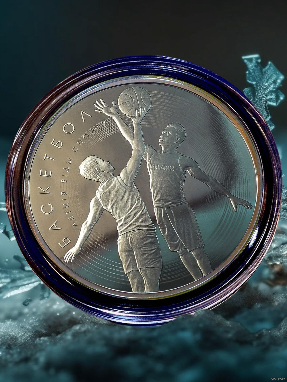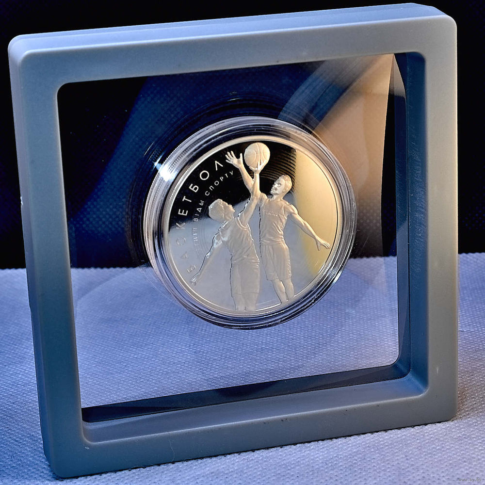 в центре в баскетбольной сетке – объемное изображение баскетбольного мяча, по контуру мяча – надпись: РЭСПУБЛІКА БЕЛАРУСЬ, номинал: 20 РУБЛЁЎ (на серебряной) и 1 РУБЕЛЬ (на медно-никелевой), год выпуска. Вверху – изображение Государственного герба Республики Беларусь. Внизу на серебряной – проба сплава.