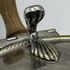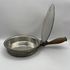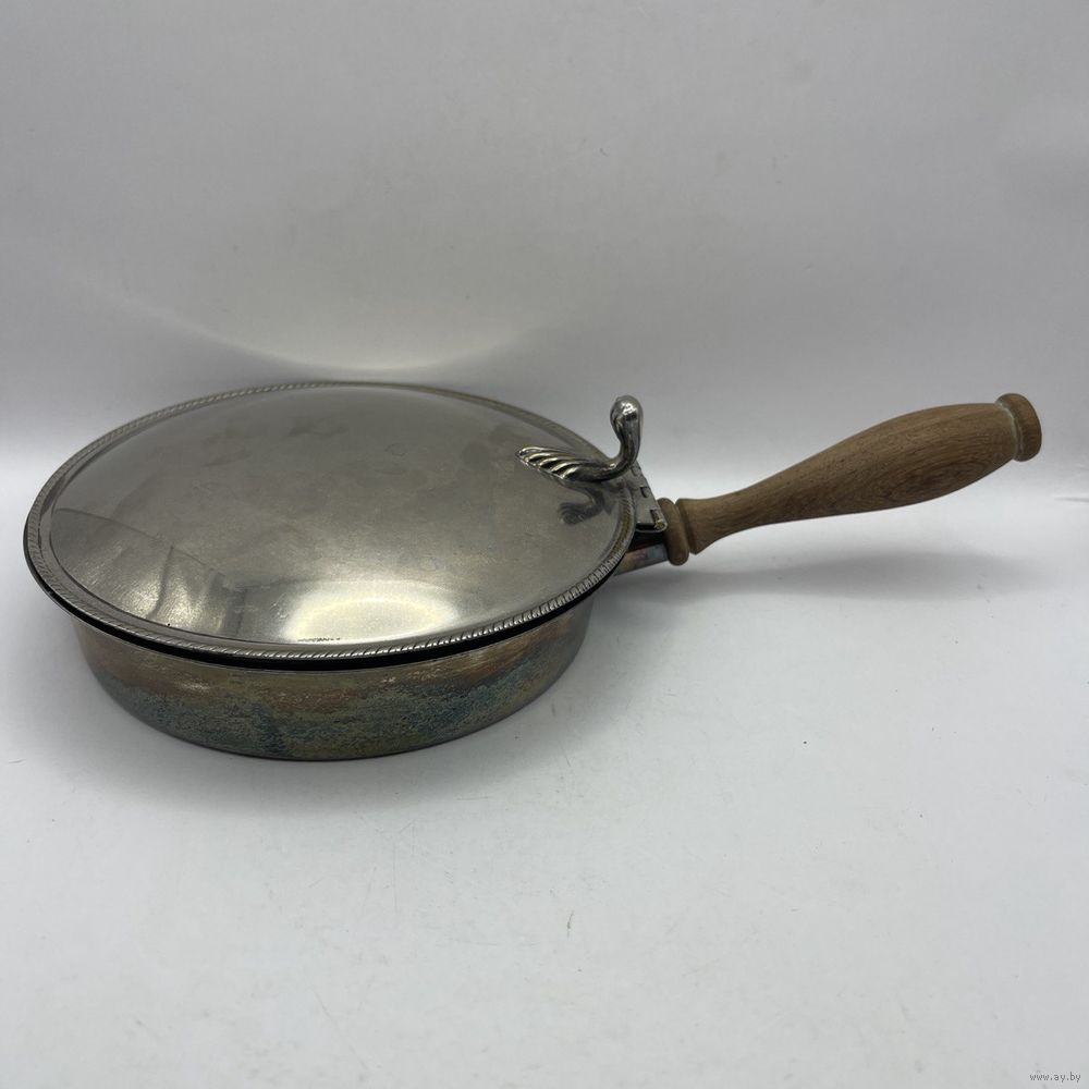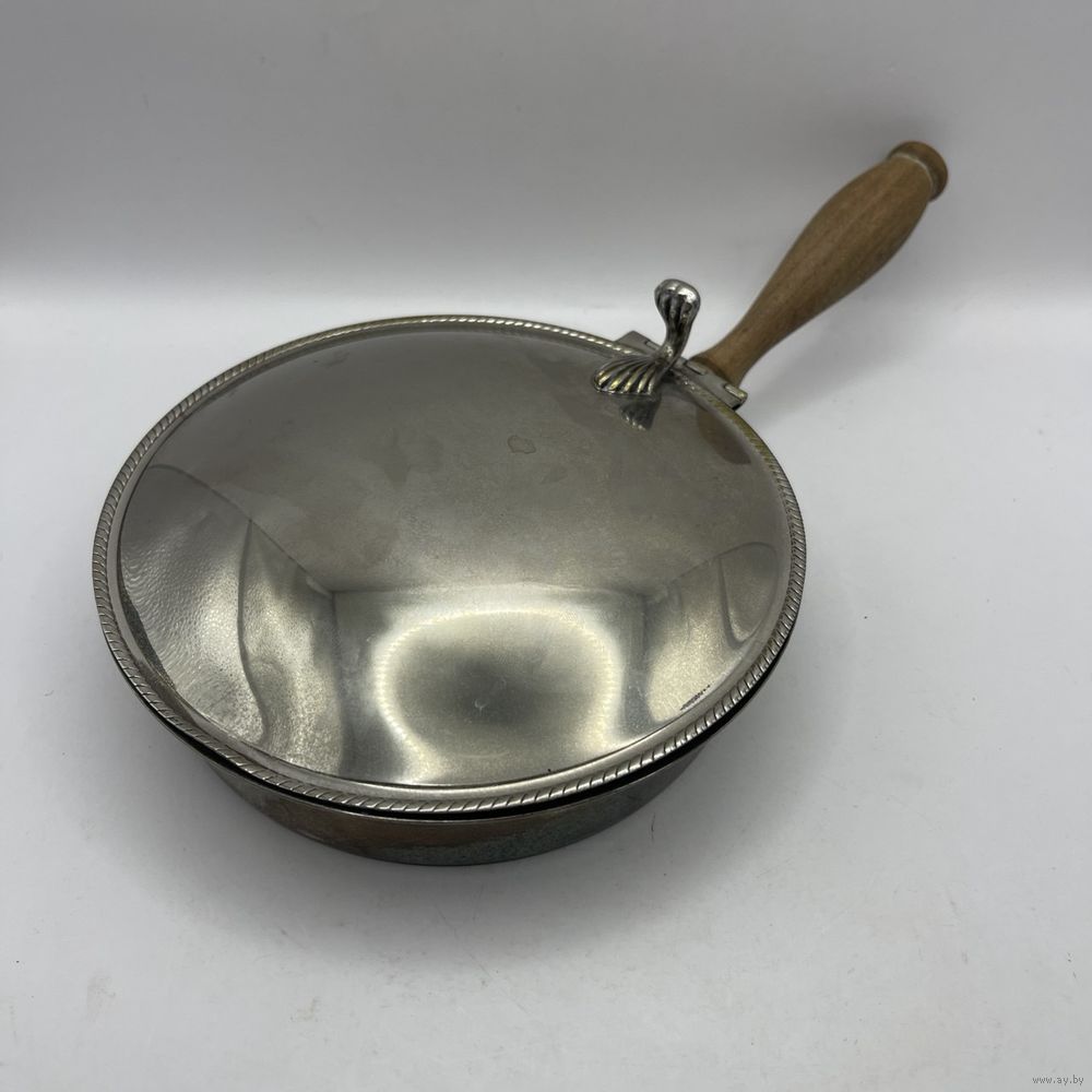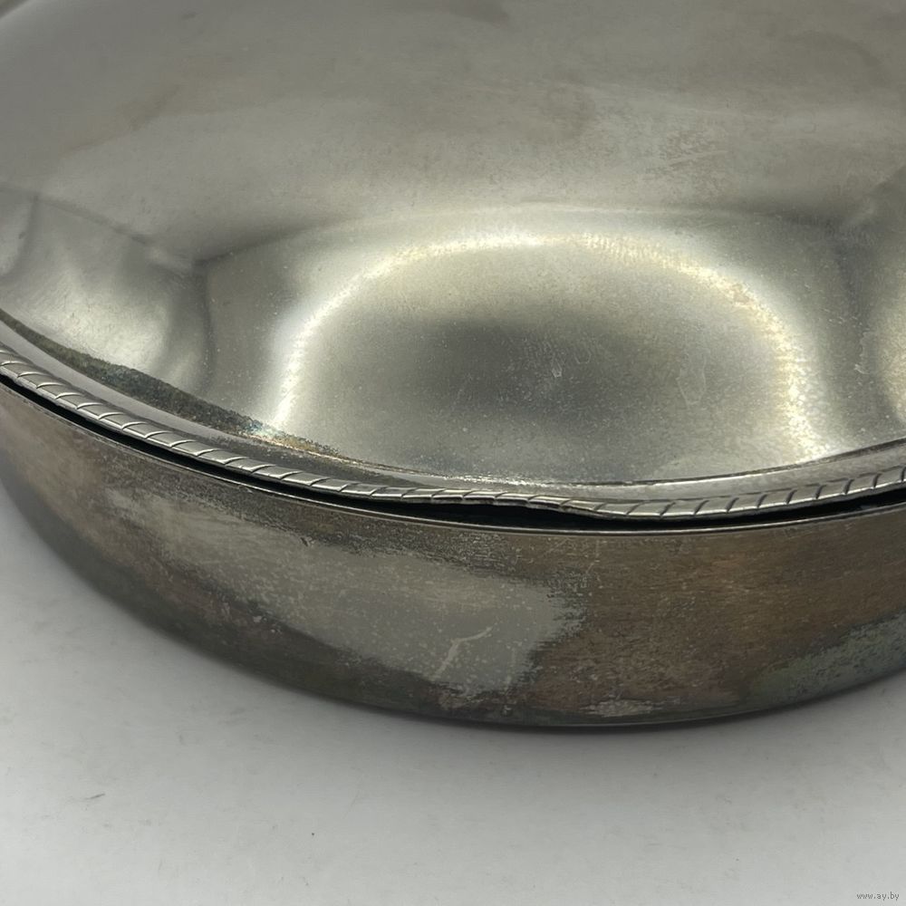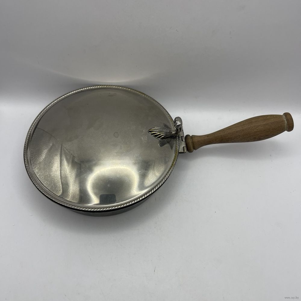 Антикварный посеребренный батлер (Silent butler, молчаливый дворецкий) с деревянной ручкой. Контейнер с откидной крышкой, используемый для сбора крошек и мелкого мусора со стола и из пепельниц. Крышка с рельефным декором по канту и упором для пальца в виде львиной лапы. Италия. 1950-е г.г. Клеймо. Длина 26 см, высота 6 см, диаметр 16 см. Естественная патина. Незначительно деформирован край крышки, на внешний вид не влияет (см. фото).