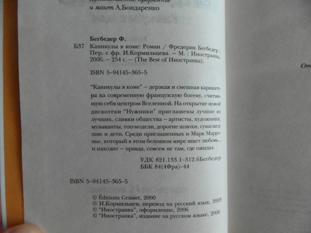 Фредерик Бегбедер - одна из самых заметных фигур в литературном мире современной Франции. Если у человека нет особых проблем, он должен себе их создать. Так мог бы звучать лозунг Фредерика Бегбедера денди и сноба, профессионального рекламщика, горячего сторонника коммунистов, писателя. Кроме того, он - один из тех пятисот избранных, без которых немыслима ночная жизнь Парижа. `Каникулы в коме` - дерзкая и смешная карикатура на современную французскую богему, считающую себя центром Вселенной. На открытие новой дискотеки `Нужники` приглашены лучшие из лучших, сливки общества - артисты, художники, музыканты, топ-модели, дорогие шлюхи, сумасшедшие и дети. Среди приглашенных и Марк Марронье, который в этом безумном мире ищет любовь... и находит - правда, совсем не там, где ожидал.
