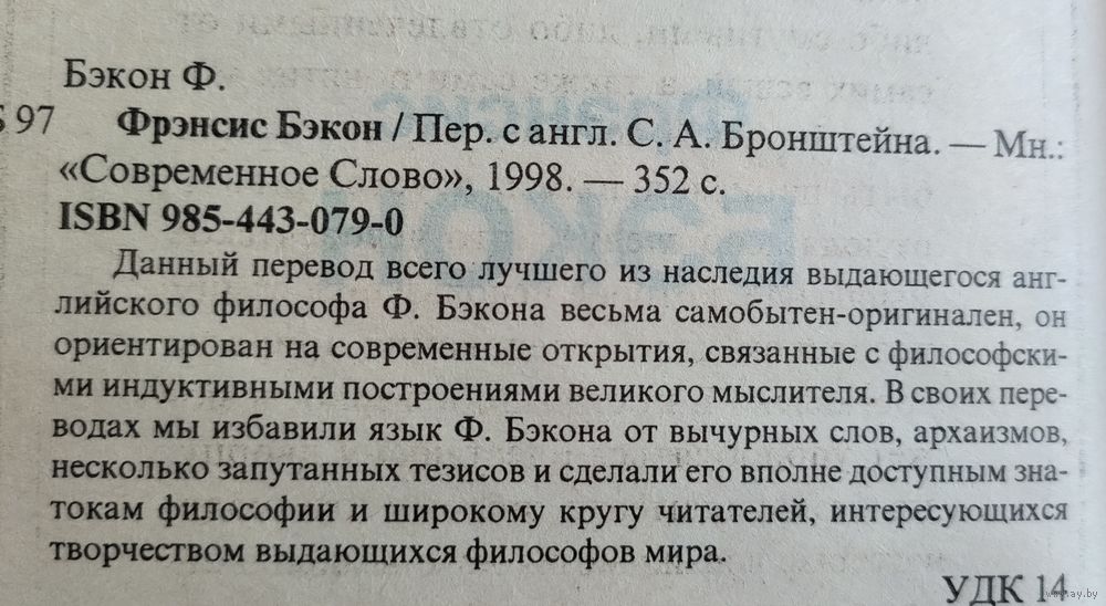 Бэкон Фрэнсис. Жизнь. Мировоззрение. Мысли, максимы, афоризмы. Минск: Современное слово, 1998г., 352 с. Твёрдый переплёт. Обычный формат.