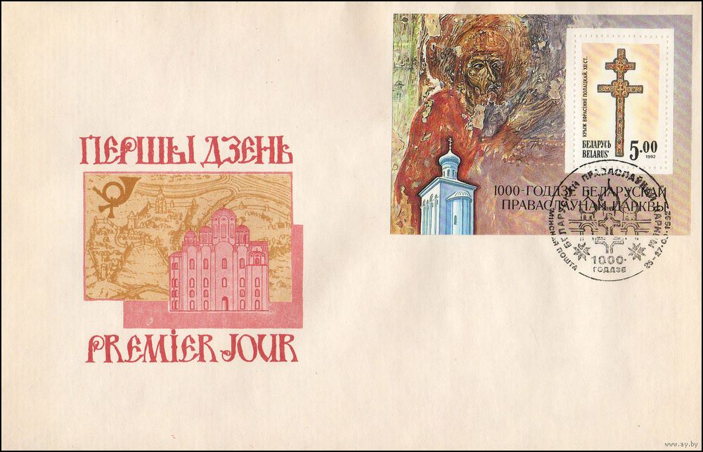 Беларусь 1992 год Конверт первого дня 1000-летие Полоцкой епархии и Православной Церкви на Беларуси