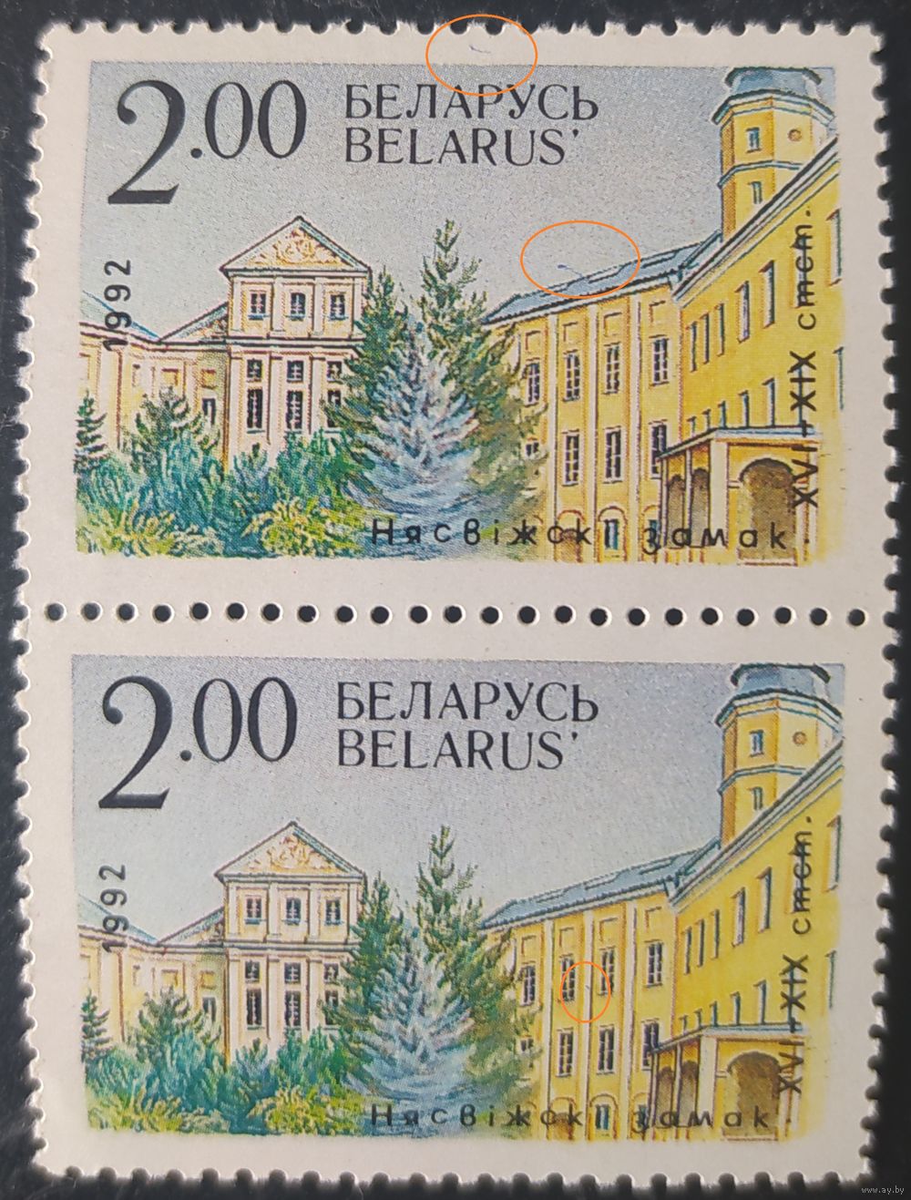 Беларусь 1992 Несвижский замок, разновидность дым над крышей , черта на поле и точка между окон .