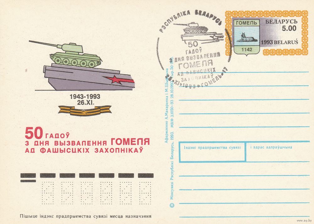 Беларусь 1993 ПК с ОМ со СГ 50 лет освобождения Гомеля (алб)