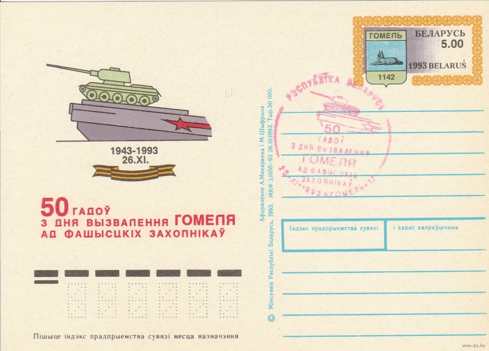 Беларусь 1993 ПК с ОМ со СГ 50 лет освобождения Гомеля (красная мастика) (алб)