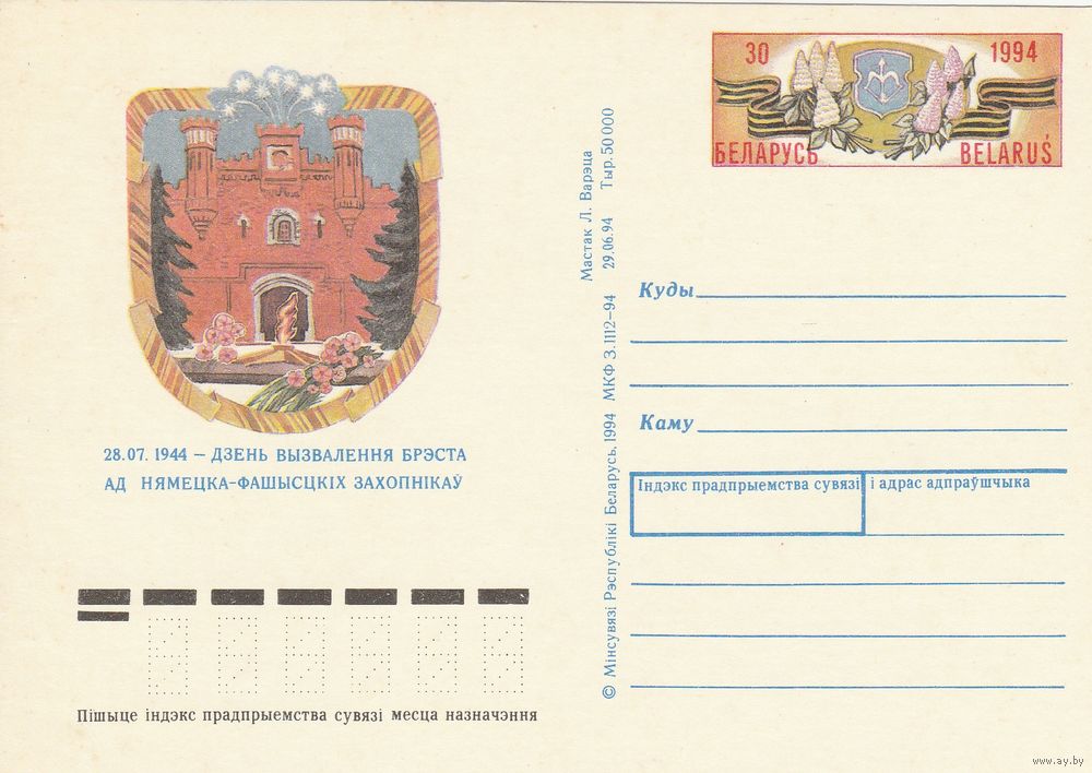 Беларусь 1994 ПК с ОМ 50 лет освобождения Бреста (свечение в УФ) (алб)