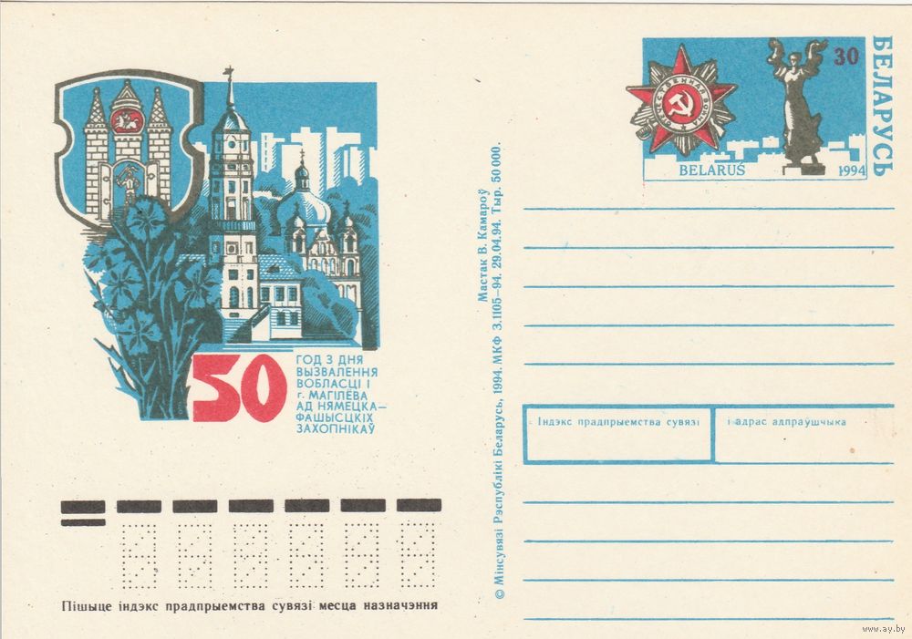 Беларусь 1994 ПК с ОМ 50 лет освобождения г. Могилева (алб)