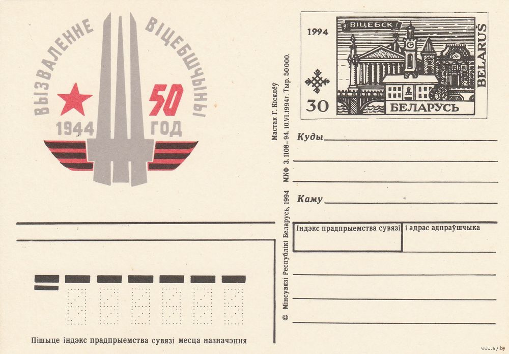 Беларусь 1994 ПК с ОМ 50 лет освобождения г. Витебска (без свечения в УФ) (алб)