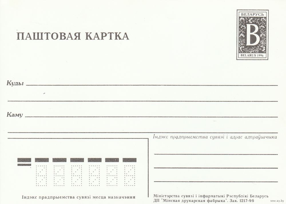 Беларусь 1996 ПК Почтовая карточка з. 1217-96 (к5)