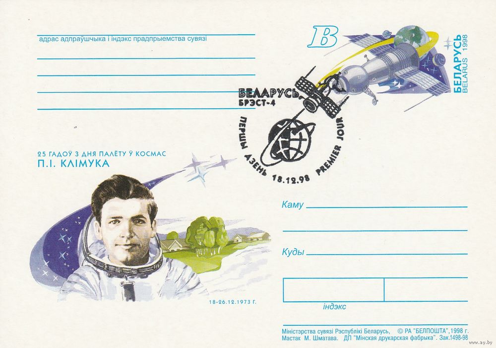 Беларусь 1998 ПК с ОМ со СГ 25 лет полета в космос П.И. Климука (алб)