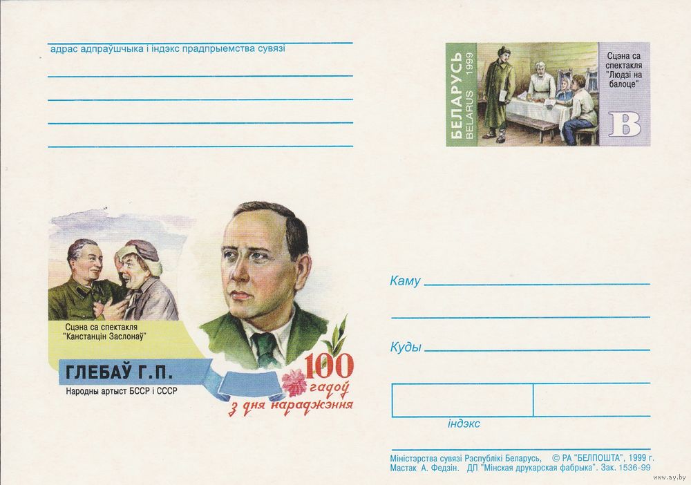 Беларусь 1999 ПК с ОМ 100 лет со дня рождения Глебова Г.П. (к5)