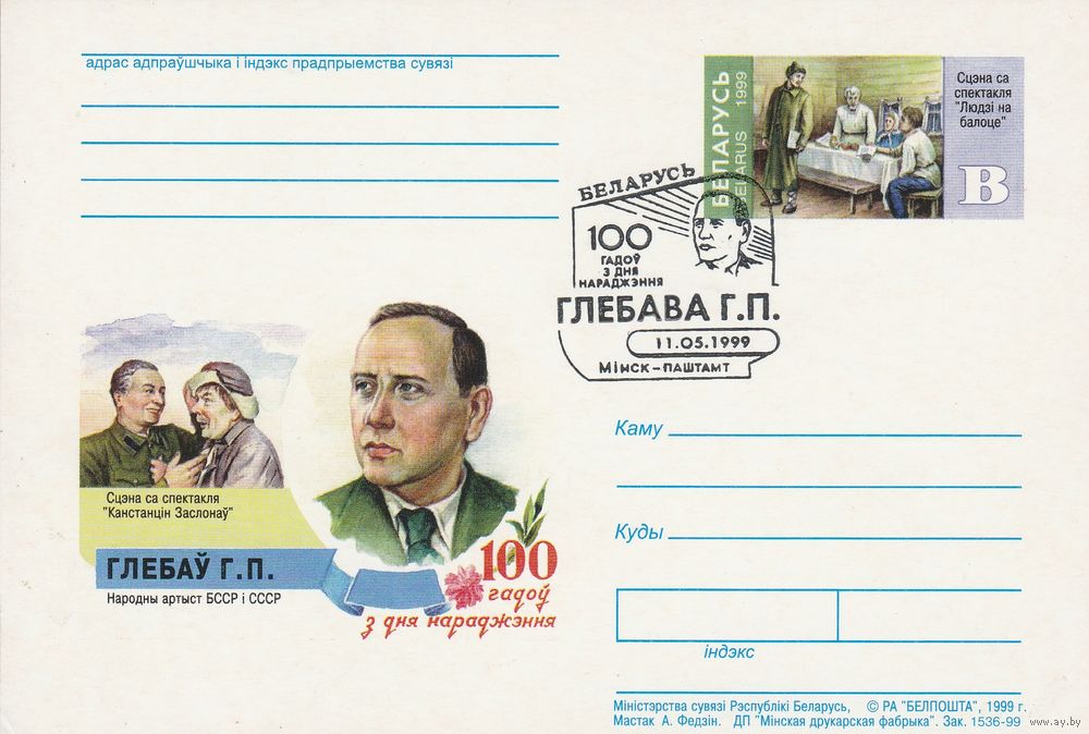 Беларусь 1999 ПК с ОМ со СГ 100 лет со дня рождения Глебова Г.П. (к5)