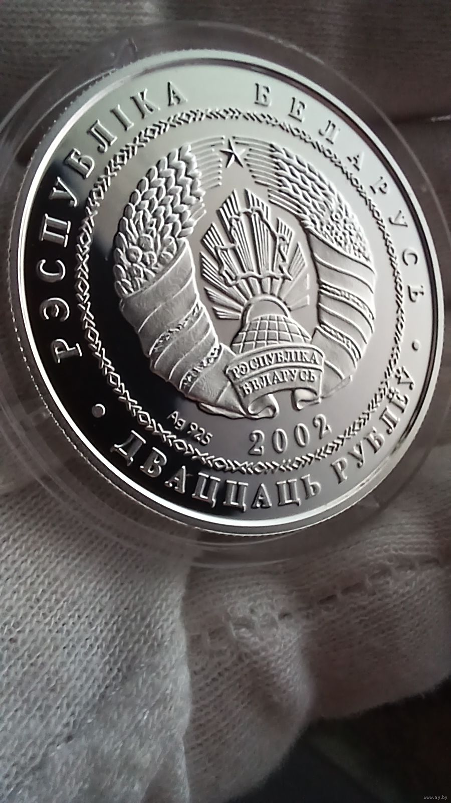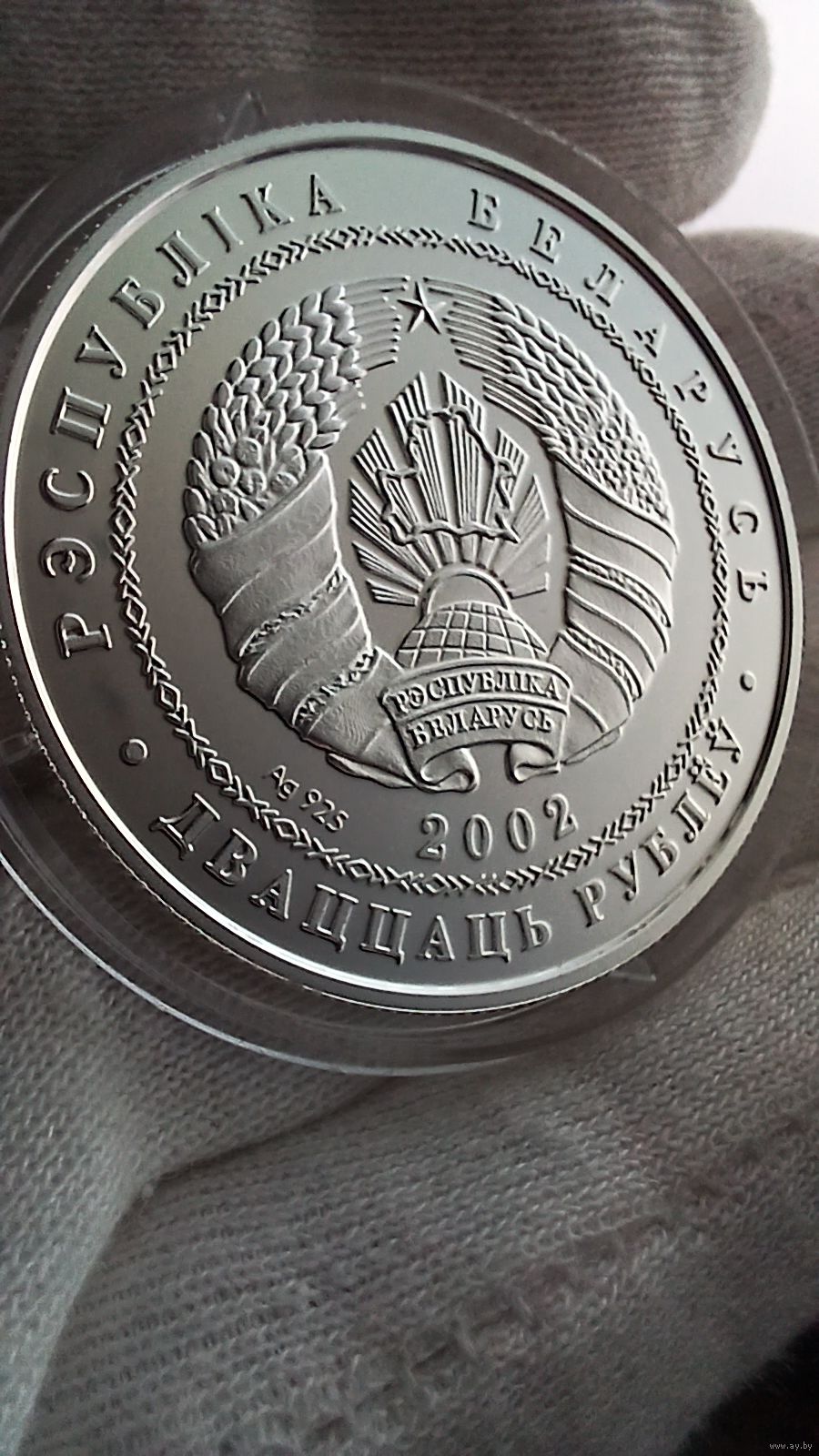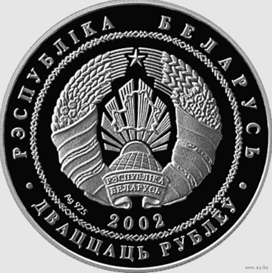 Аверс: в круге, обрамленном геометрическим орнаментом, – рельефное изображение Государственного герба Республики Беларусь, под ним – год чеканки и проба сплава; по кругу надписи: в верхней части – "РЭСПУБЛIКА БЕЛАРУСЬ", в нижней – "ДВАЦЦАЦЬ РУБЛЁЎ".