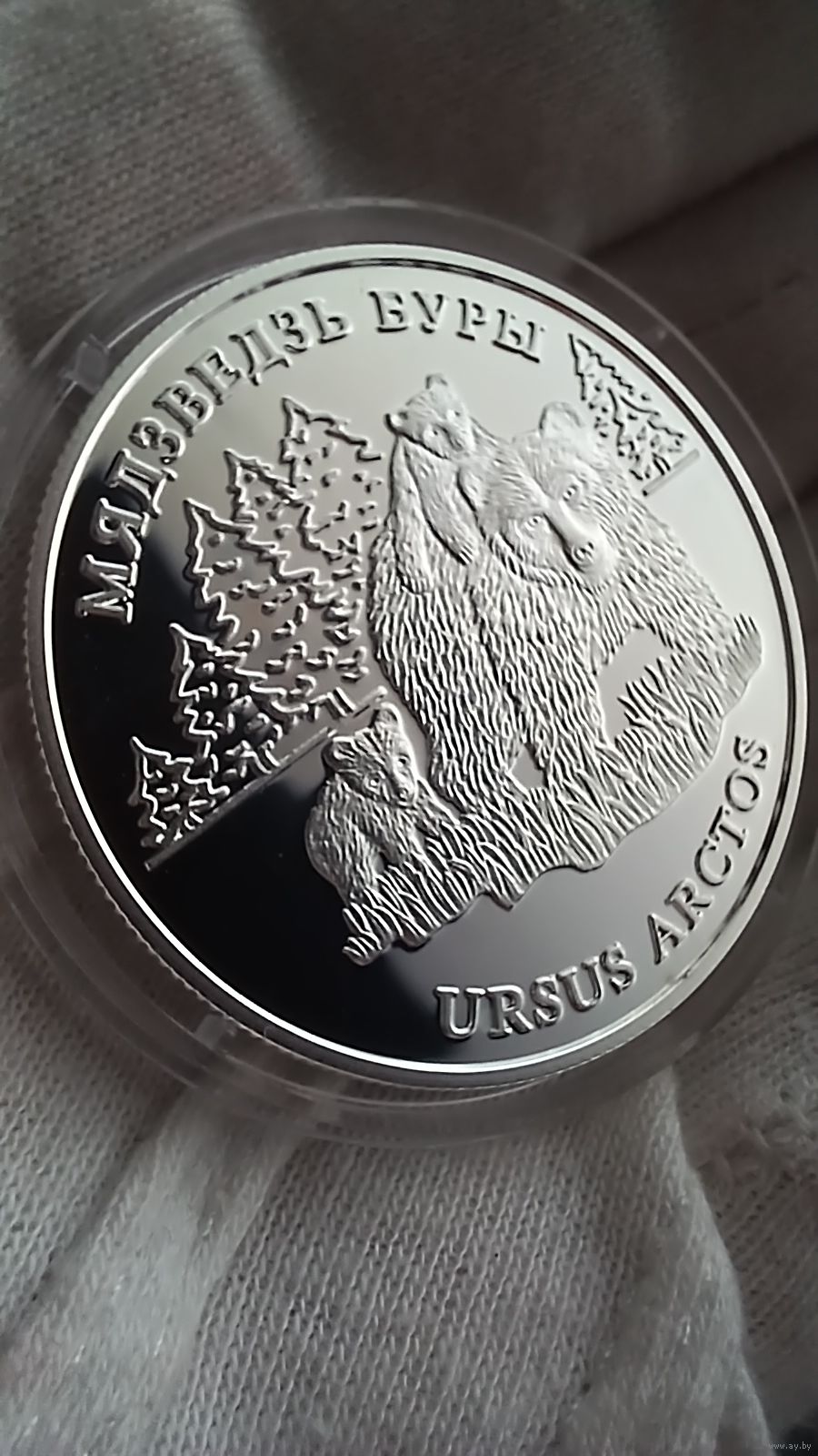 Реверс: в центре – рельефное изображение трех медведей на фоне елового леса; вверху – надпись по кругу "МЯДЗВЕДЗЬ БУРЫ", внизу – "URSUS ARCTOS"