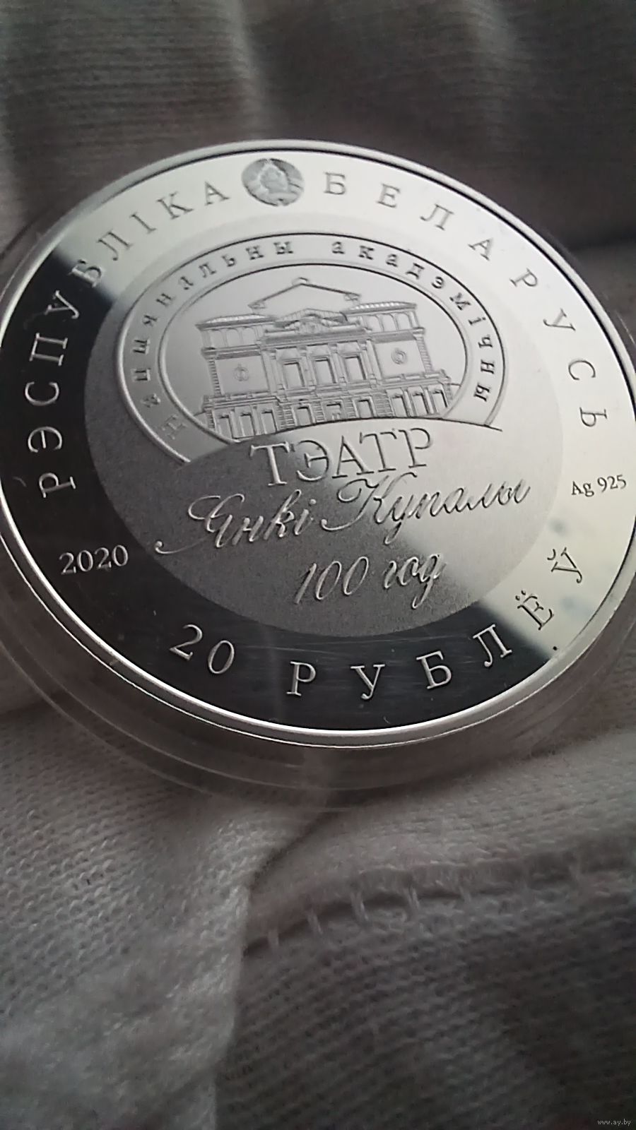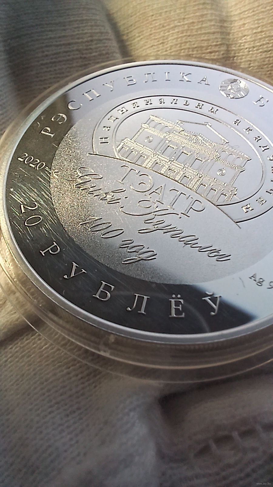 Аверс: вверху – рельефное изображение Государственного герба Республики Беларусь; в центре – логотип театра Янки Купалы и надпись: 100 год; по кругу надписи: вверху – РЭСПУБЛІКА БЕЛАРУСЬ; внизу – 20 РУБЛЁЎ, слева – год чеканки, справа – проба сплава