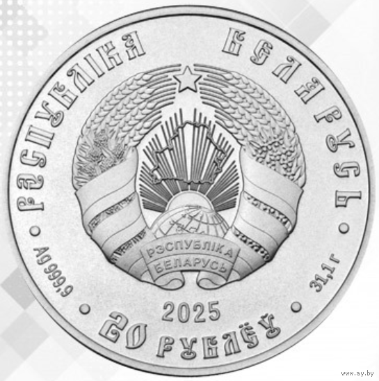 Аверс: в центре – рельефное изображение Государственного герба Республики Беларусь, вверху по кругу надпись: РЭСПУБЛІКА БЕЛАРУСЬ, внизу – год чеканки и номинал 20 РУБЛЁЎ, слева – проба сплава, справа – масса монеты.