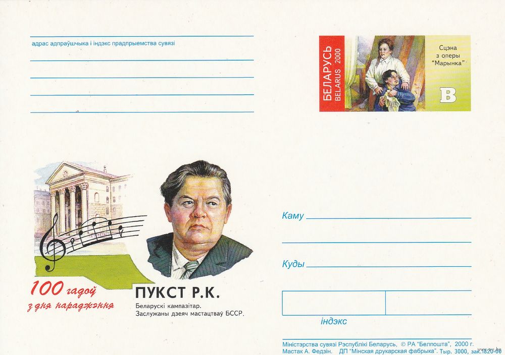 Беларусь 2000 ПК с ОМ 100 лет со дня рожд. Пукста Р.К. (алб)