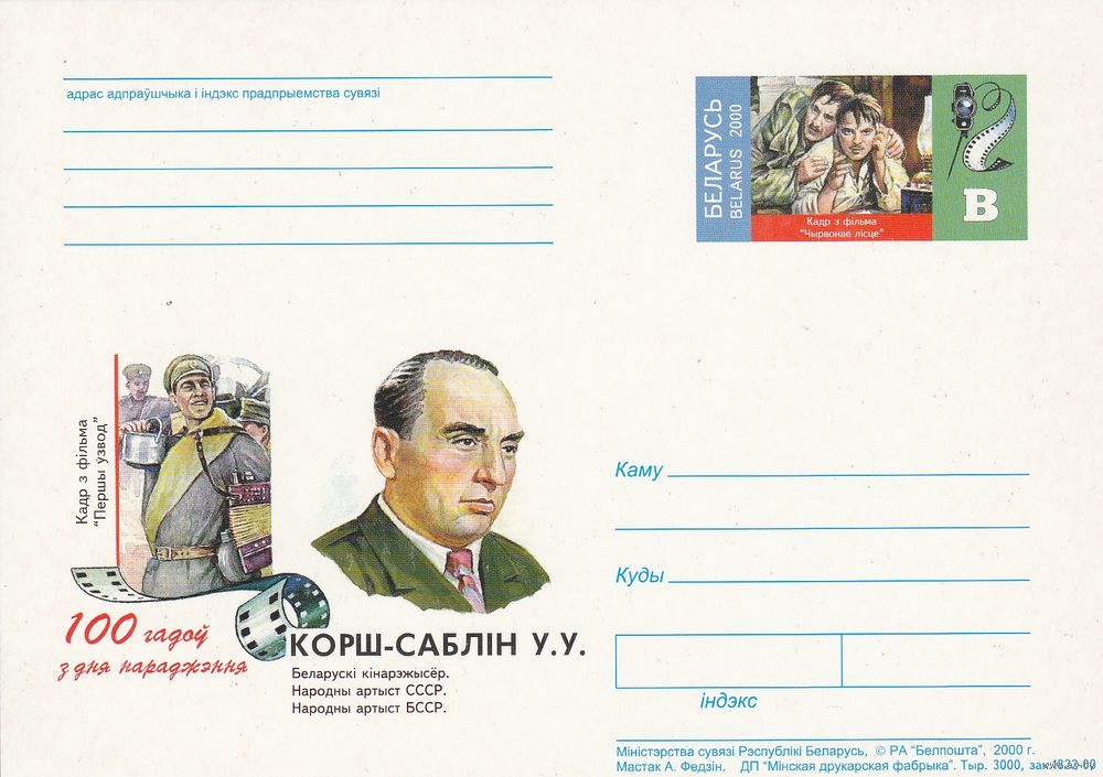 Беларусь 2000 ПК с ОМ 100 лет со дня рождения Корш-Саблина В.В. (алб)