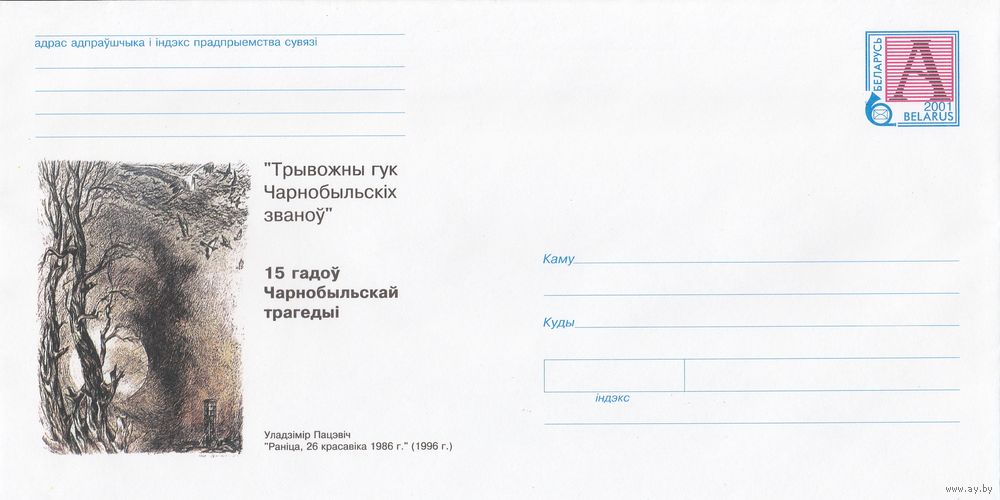 Беларусь 2001 15 лет Чернобыльской трагедии. Тревожный звук Чернобыльских колоколов. Репродукция гравюры Владимира Пацевича Утро, 26 апреля 1986 г. (к4а)