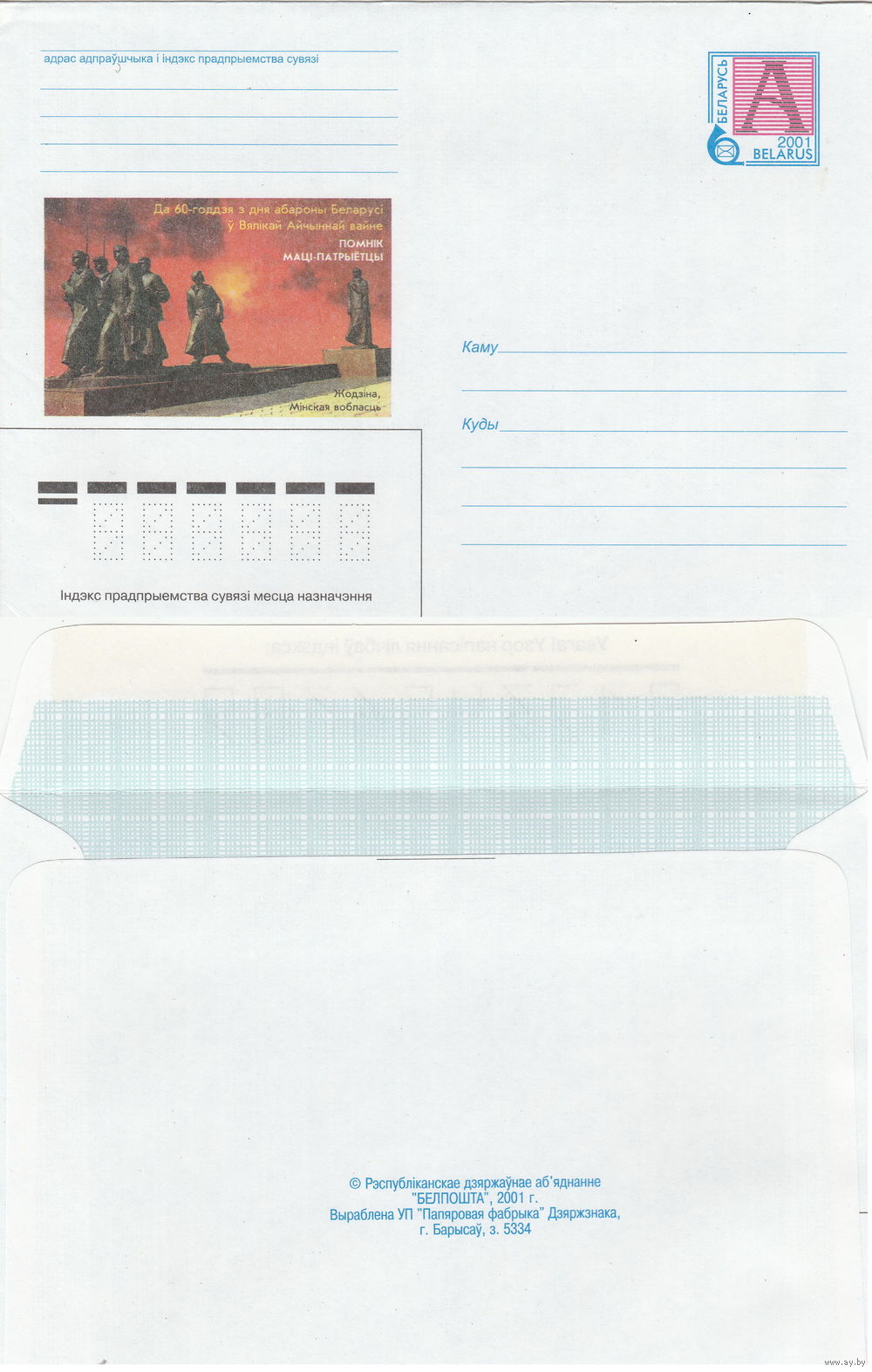 Беларусь 2001 Да 60-годдзя з дня абароны Беларусi ў Вялiкай Айчыннай вайне. Помнiк Мацi-патрыётцы. Жодзiна. Мiнская вобласць. К 60-летию со дня Беларуси в Великой Отечественной войне. Памятник М (к4)