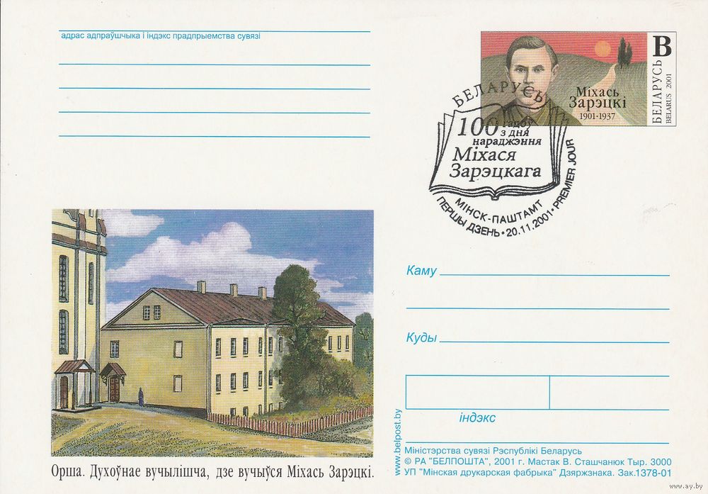 Беларусь 2001 ПК с ОМ со СГ 100 лет со дня рождения Михася Зарецкого (к5)