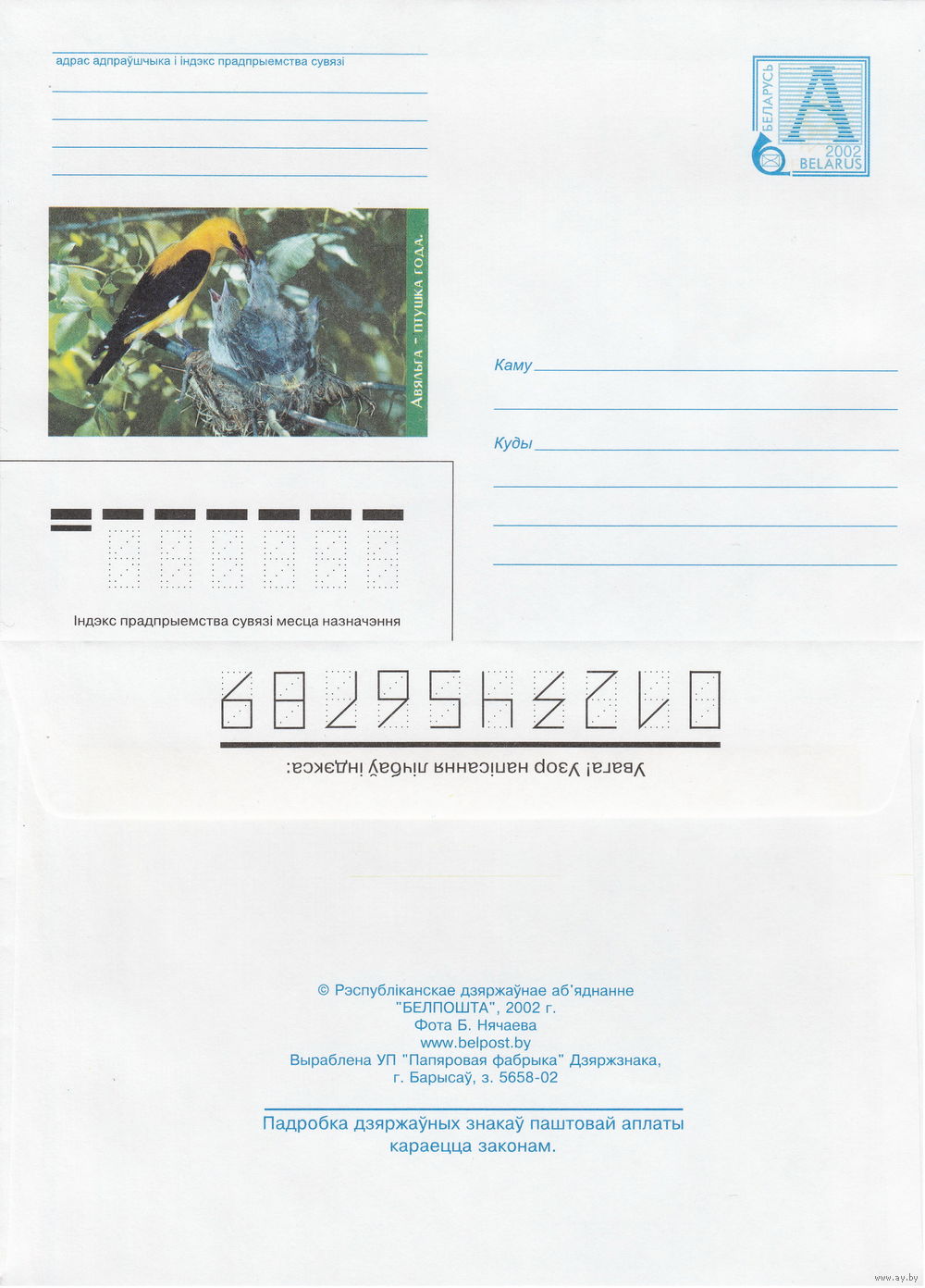 Беларусь 2002 Иволга – птица 2002 года (к4)
