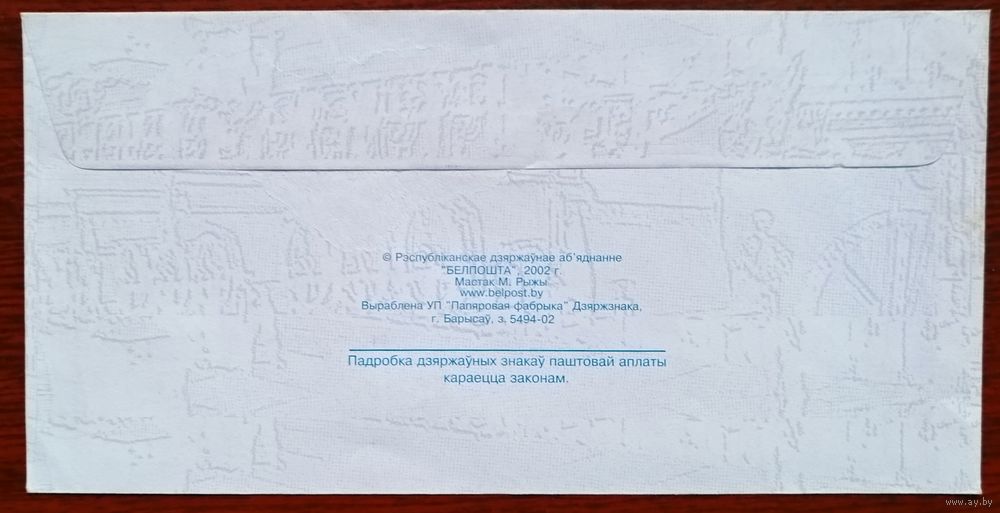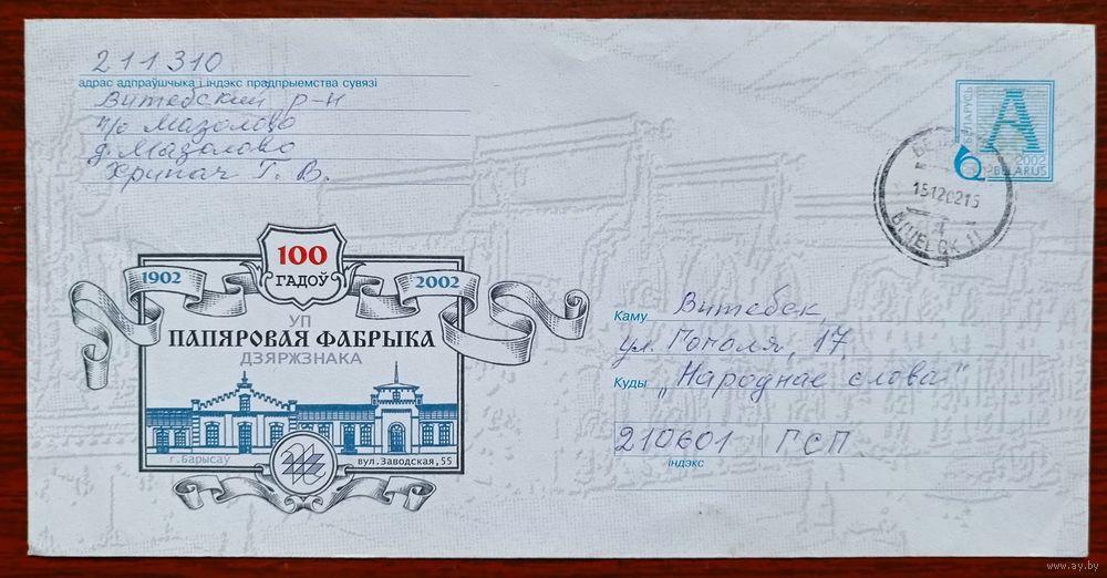 Беларусь 2002 конверт Борисов фабрика госзнак/прошедший почту /