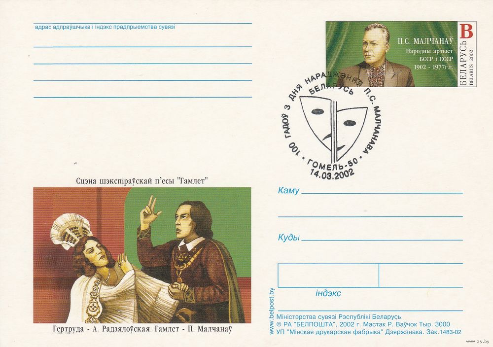Беларусь 2002 ПК с ОМ со СГ 100 лет со дня рождения Молчанова П.С. (к5)