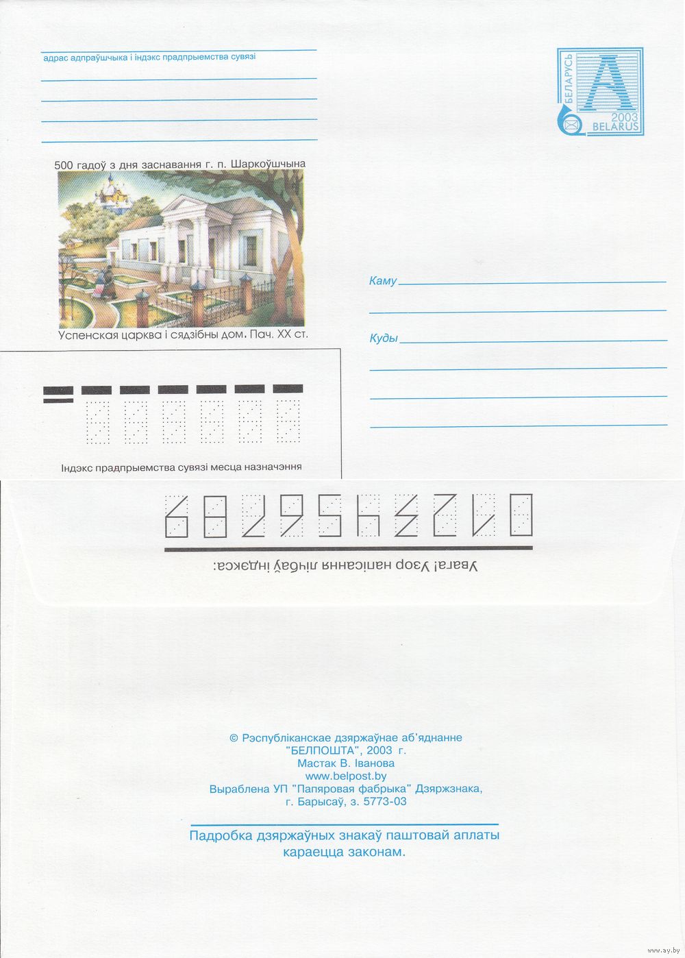Беларусь 2003 500 лет со дня основания г. п. Шарковщина. Успенская церковь и приусадебный дом. Нач. XX в (к4)