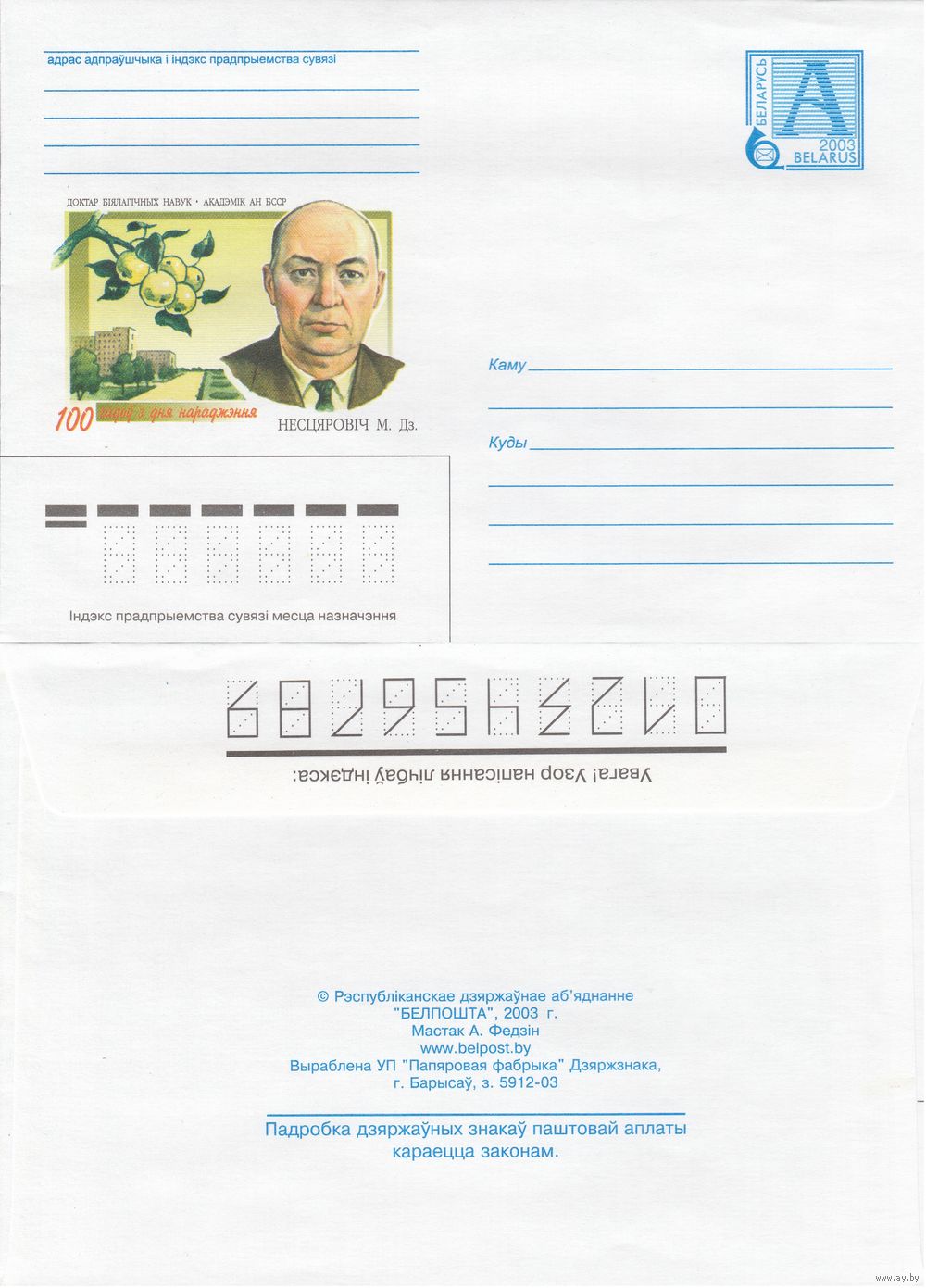 Беларусь 2003 Доктор биологических наук. Академик АН БССР. 100 лет со дня рождения. Нестерович Н. Д. (к4)