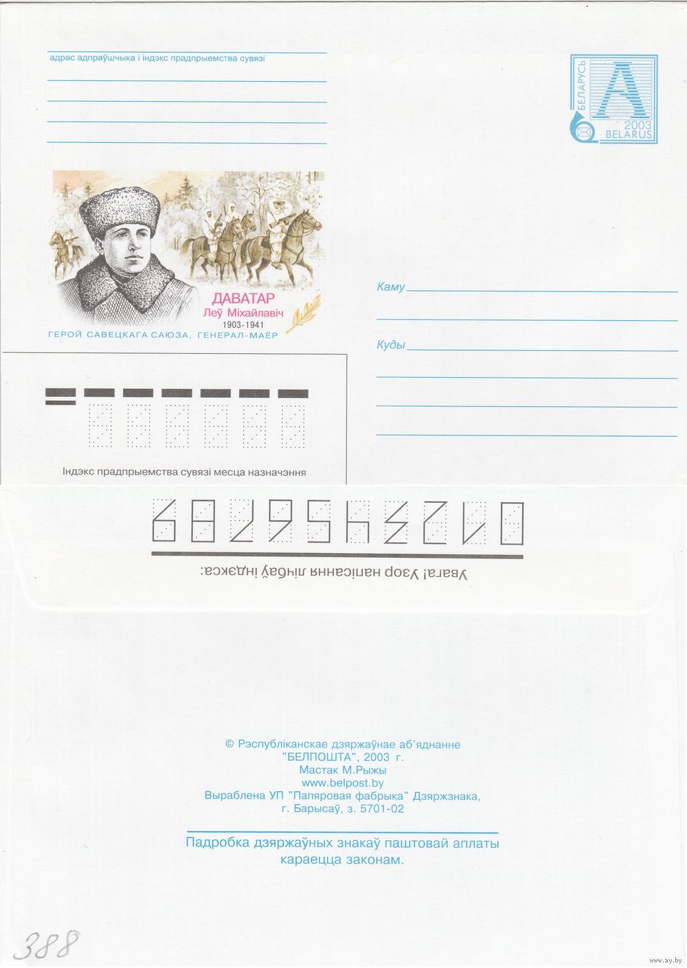 Беларусь 2003 Доватор Лев Михалович. 1903-1941. Герой Советского Союза, генерал-майор (к4)