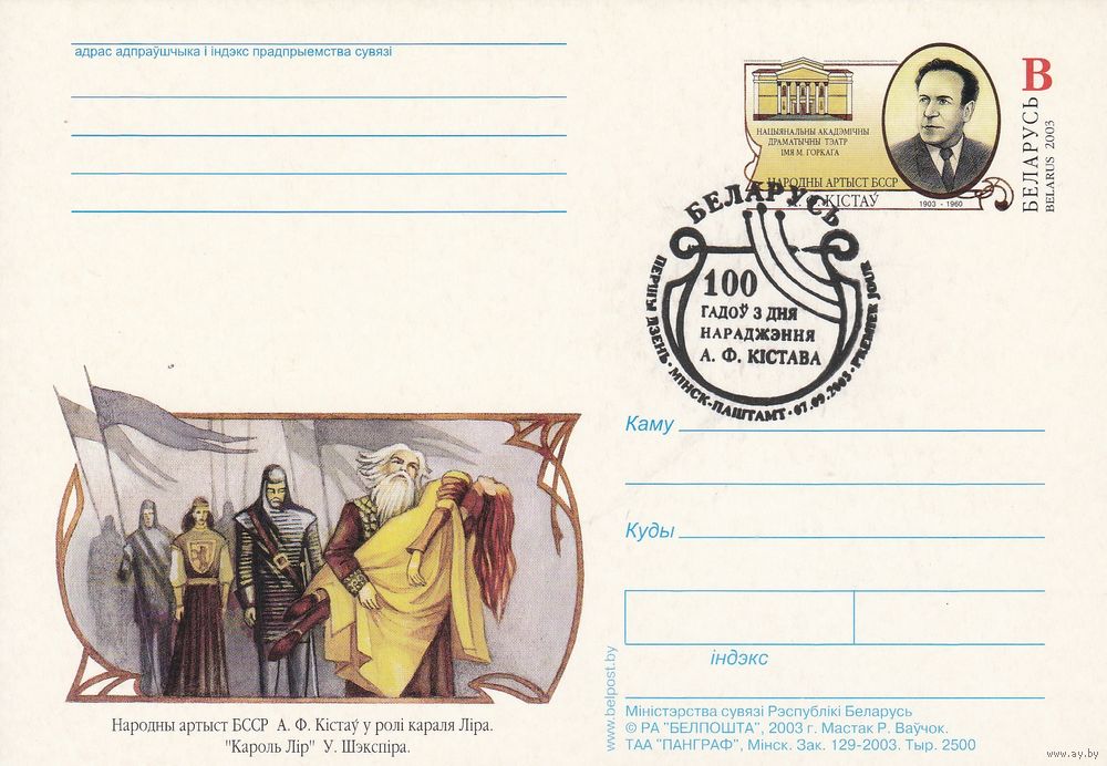 Беларусь 2003 ПК с ОМ со СГ 100 лет со дня рождения А.Ф. Кистова (к5)