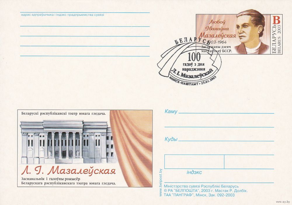 Беларусь 2003 ПК с ОМ со СГ 100 лет со дня рождения Мазолевской Л.И. (к5)