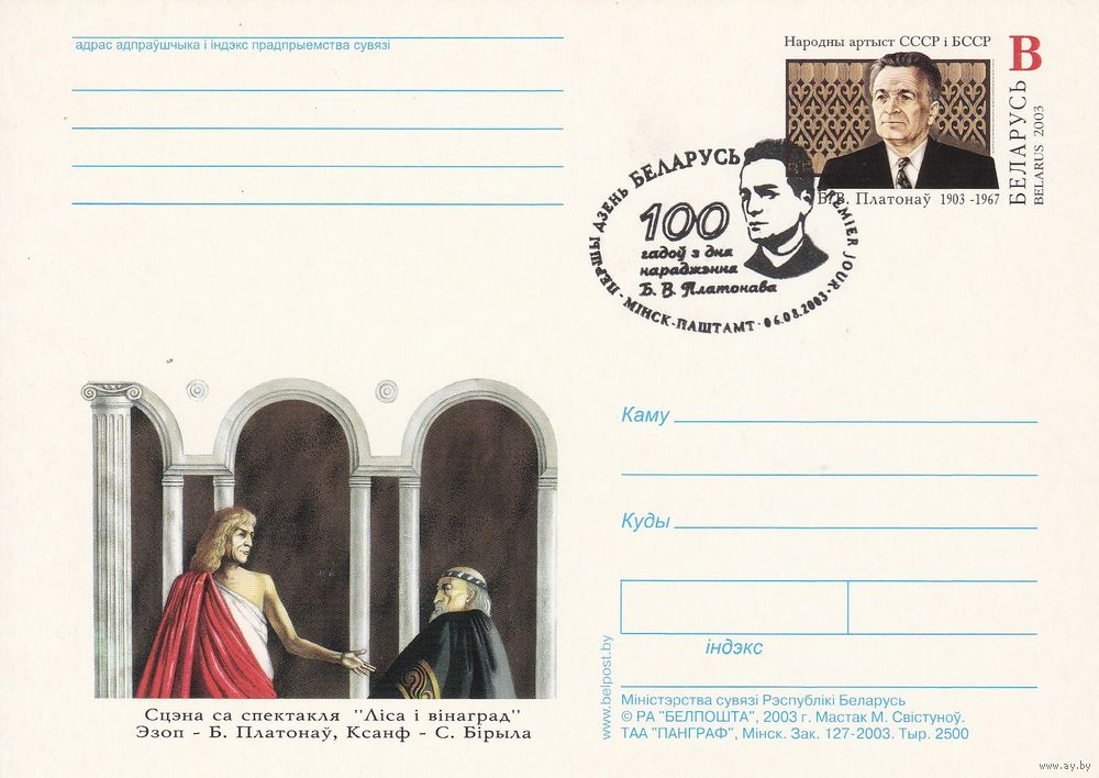 Беларусь 2003 ПК с ОМ со СГ 100 лет со дня рождения Платонова Б.В. (к5)