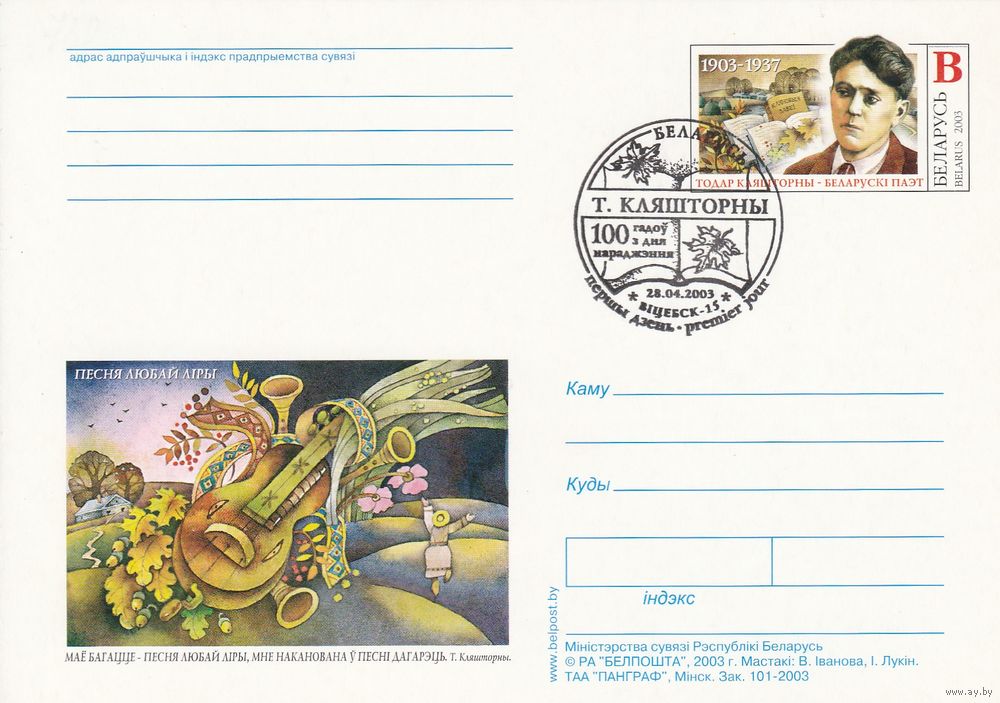 Беларусь 2003 ПК с ОМ со СГ 100 лет со дня рождения Тодора Кляшторного (к5)