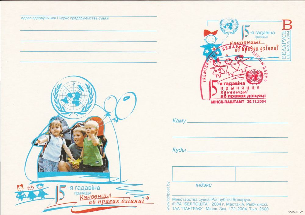 Беларусь 2004 ПК с ОМ со СГ 15-я годовщина Конвенции о правах ребенка (алб)