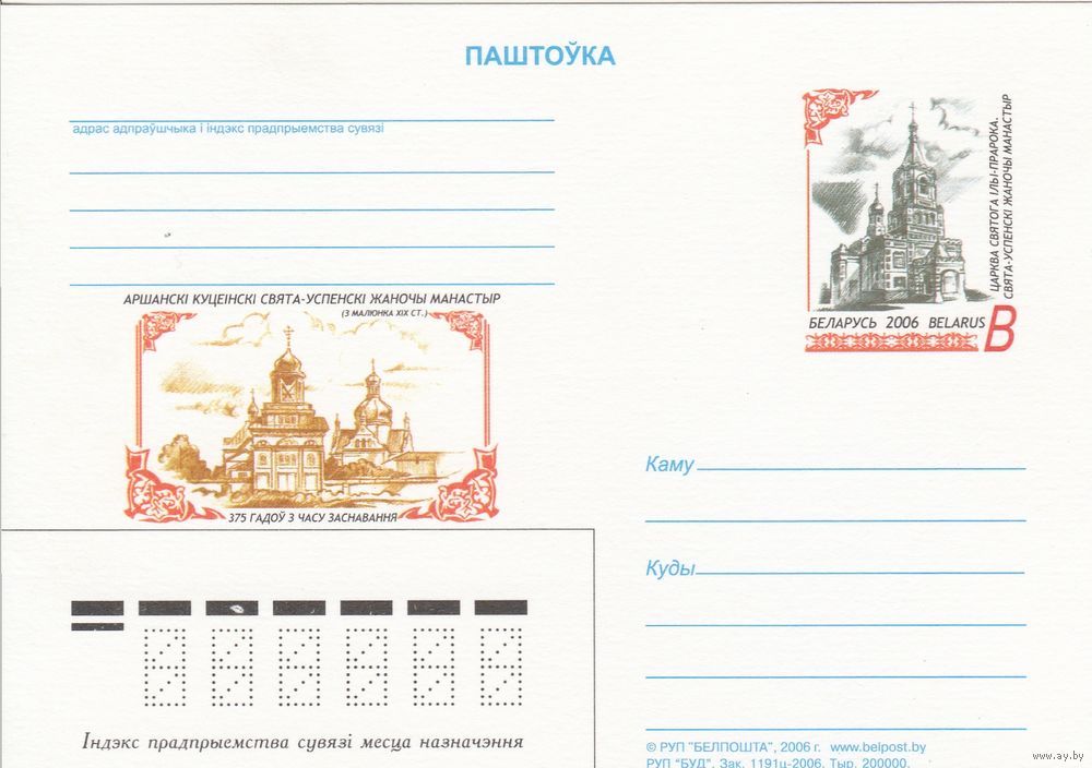 Беларусь 2006 ПК с ОМ 375 лет основания Оршанского Кутеинского Свято-Успенского женского монастыря (алб)