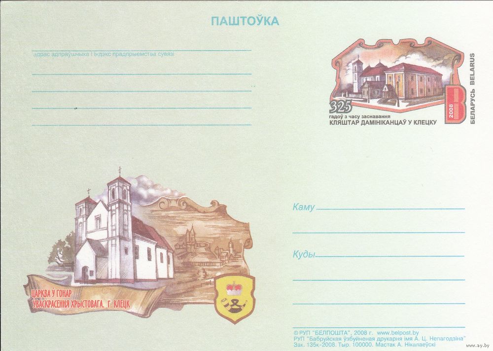 Беларусь 2008 ПК с ОМ 325 лет со времени основания монастыря доминиканцев в Клецке (к5)