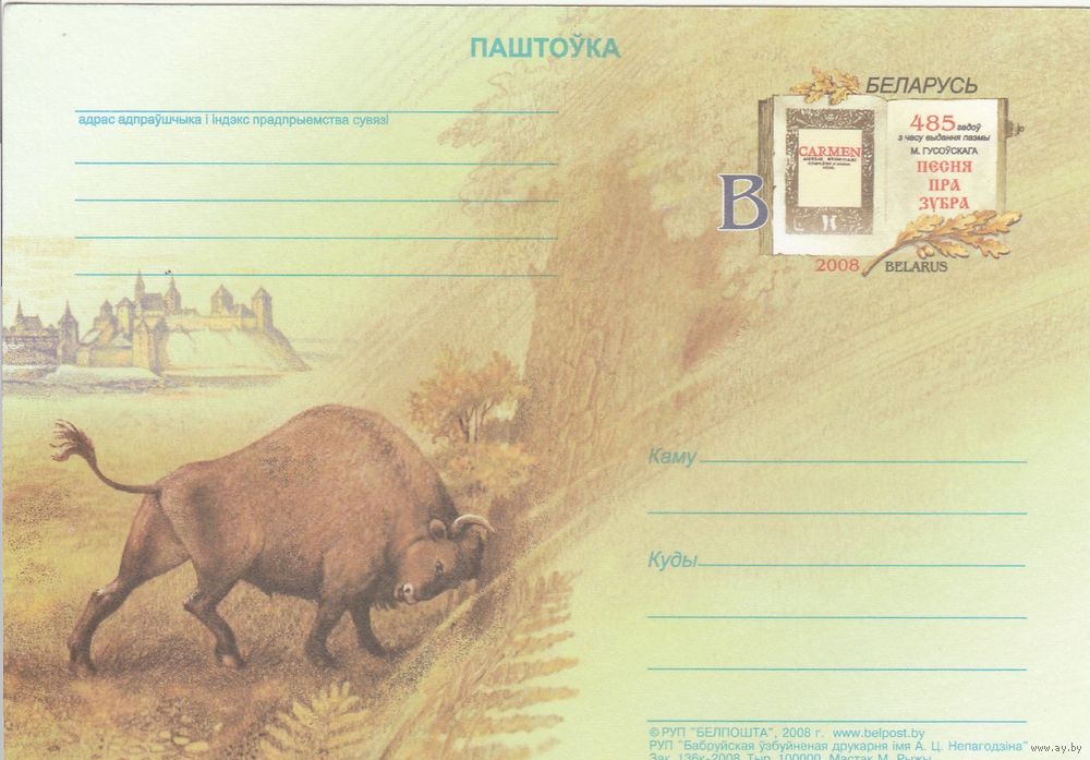 Беларусь 2008 ПК с ОМ 485 лет со времени издания поэмы Н. Гусовского Песнь о зубре (к5)