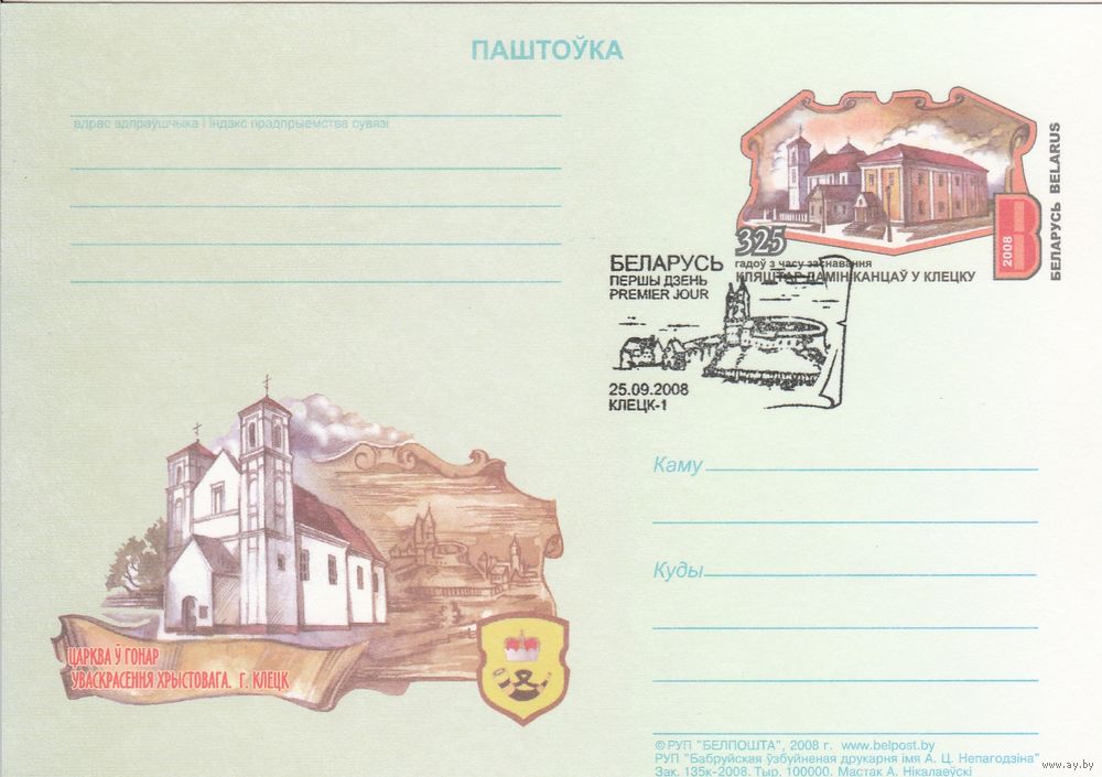 Беларусь 2008 ПК с ОМ со СГ 325 лет со времени основания монастыря доминиканцев в Клецке (алб)